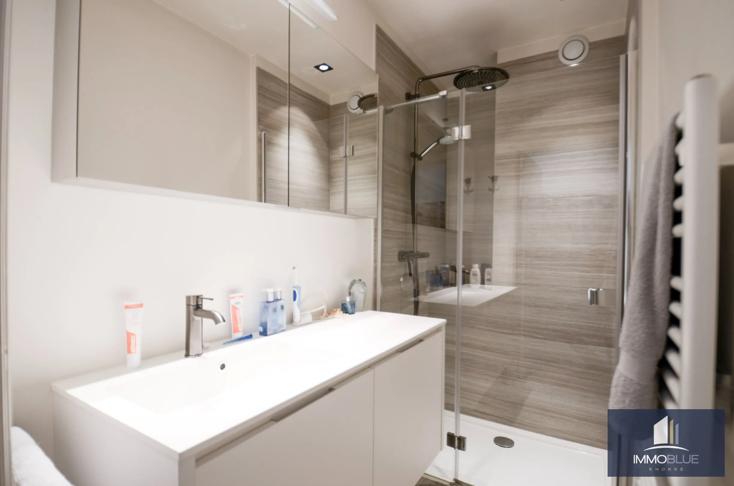 Uniek gelegen appartement met frontaal zeezicht gelegen in een prestigieuze residentie in het Zoute. Indeling: Ruime inkomhal met gastentoilet en vestiaire. Leefruimte uitgevend op het terras vooraan. Halfopen keuken voorzien van alle comfort uitgevend op een klein terras. Vanuit de leefruimte en de keuken kan men genieten van een prachtig panoramisch zicht over de zee. Masterbedroom met ingemaakte kasten en aanpalend de badkamer, lavabo en toilet. Tweede volwaardige slaapkamer met ingemaakte kasten. Beiden kamers geven uit op het terras achteraan. Douchekamer. Derde kleinere slaapkamer. Privatieve ruime kelder en gemeenschappelijke fietsenberging in de residentie. Mogelijkheid tot aankoop van een staanplaats in de residentie.