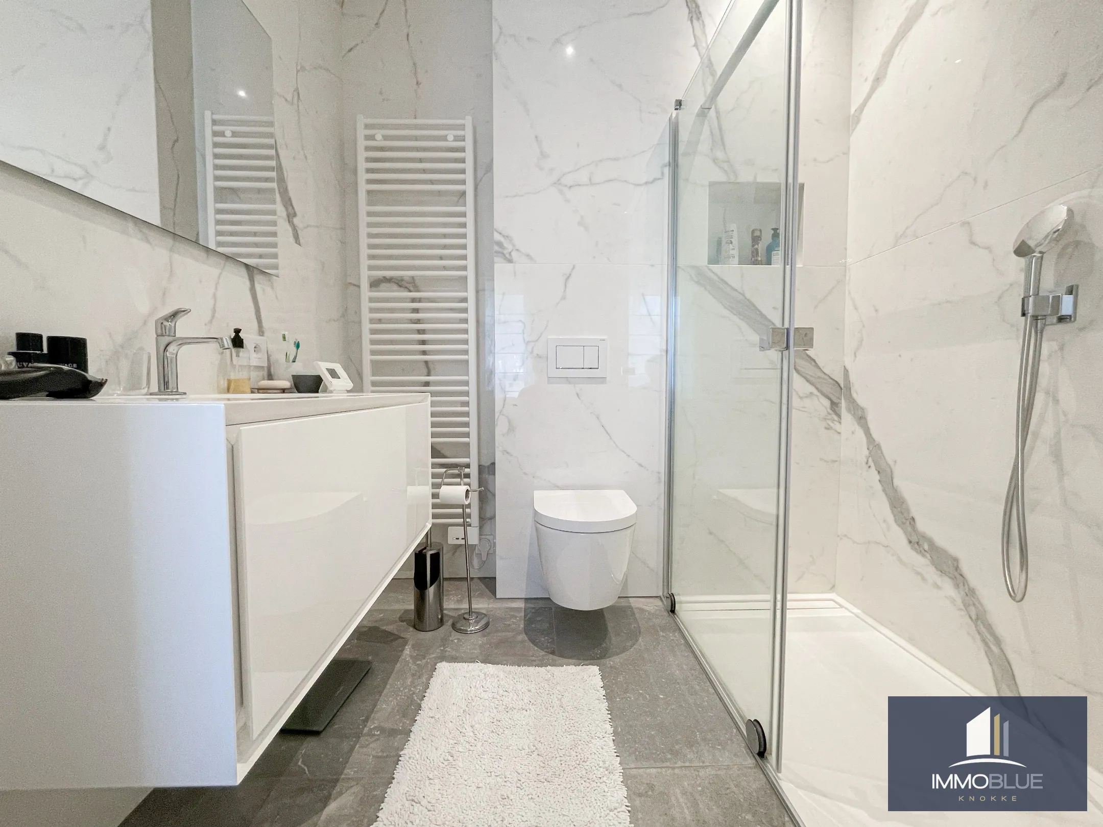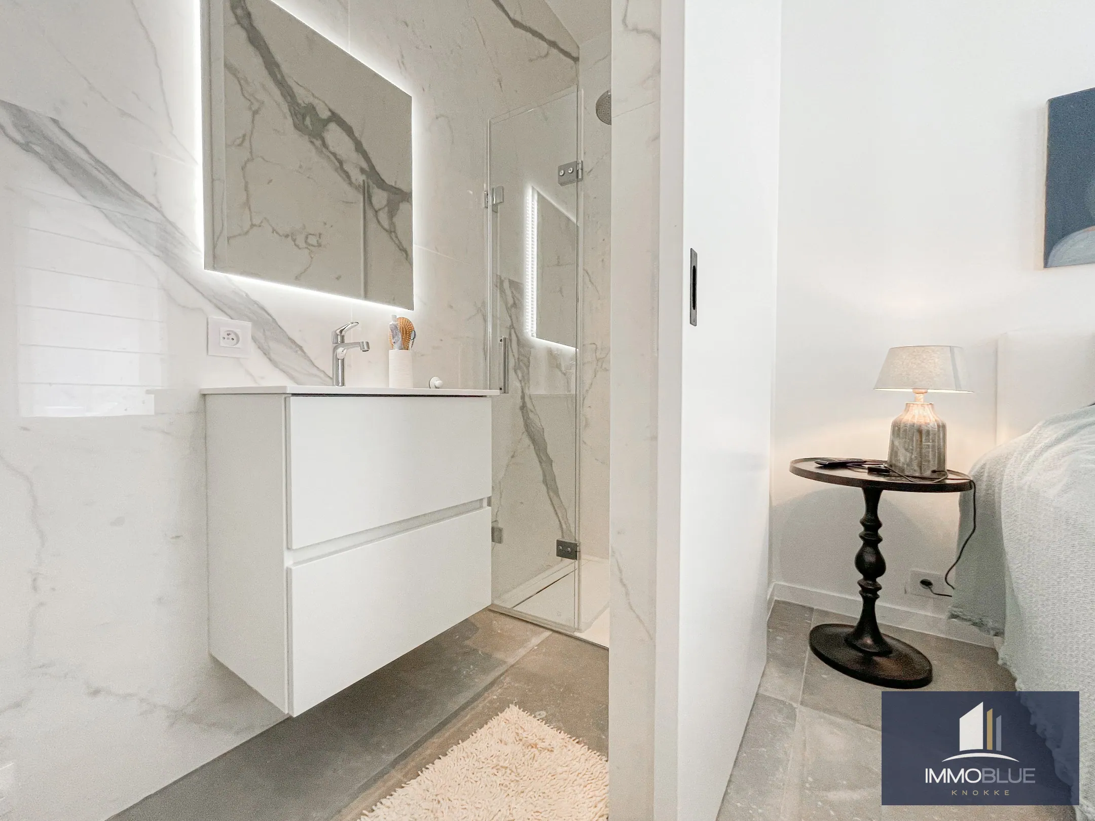 Subliem, luxueus tuinappartement met dubbele garage, rustig gelegen in een standingvolle zeer recente residentie. Indeling: Inkom met gastentoilet en vestiaire. Zeer gezellige leefruimte bestaande uit een volledig geïnstalleerde open keuken en een gezellig salon uitgevend op het terras en tuin. Masterbedroom met ingemaakte kasten en douchekamer. Tweede volwaardige slaapkamer met ingemaakte kasten en douchekamer uitgevend op het terras. Aparte berging voorzien voor het plaatsen van een wasmachine en droogkast. Ruim terras en tuin met aanpalend een dubbele garage. Het appartement is voorzien van het nodige comfort o.a. alarm, vloerverwarming (elke ruimte afzonderlijk regelbaar), ventilatiesysteem met koeling, hoge plafonds:,.. Gemakkelijk bereikbare fietsenberging in de residentie.