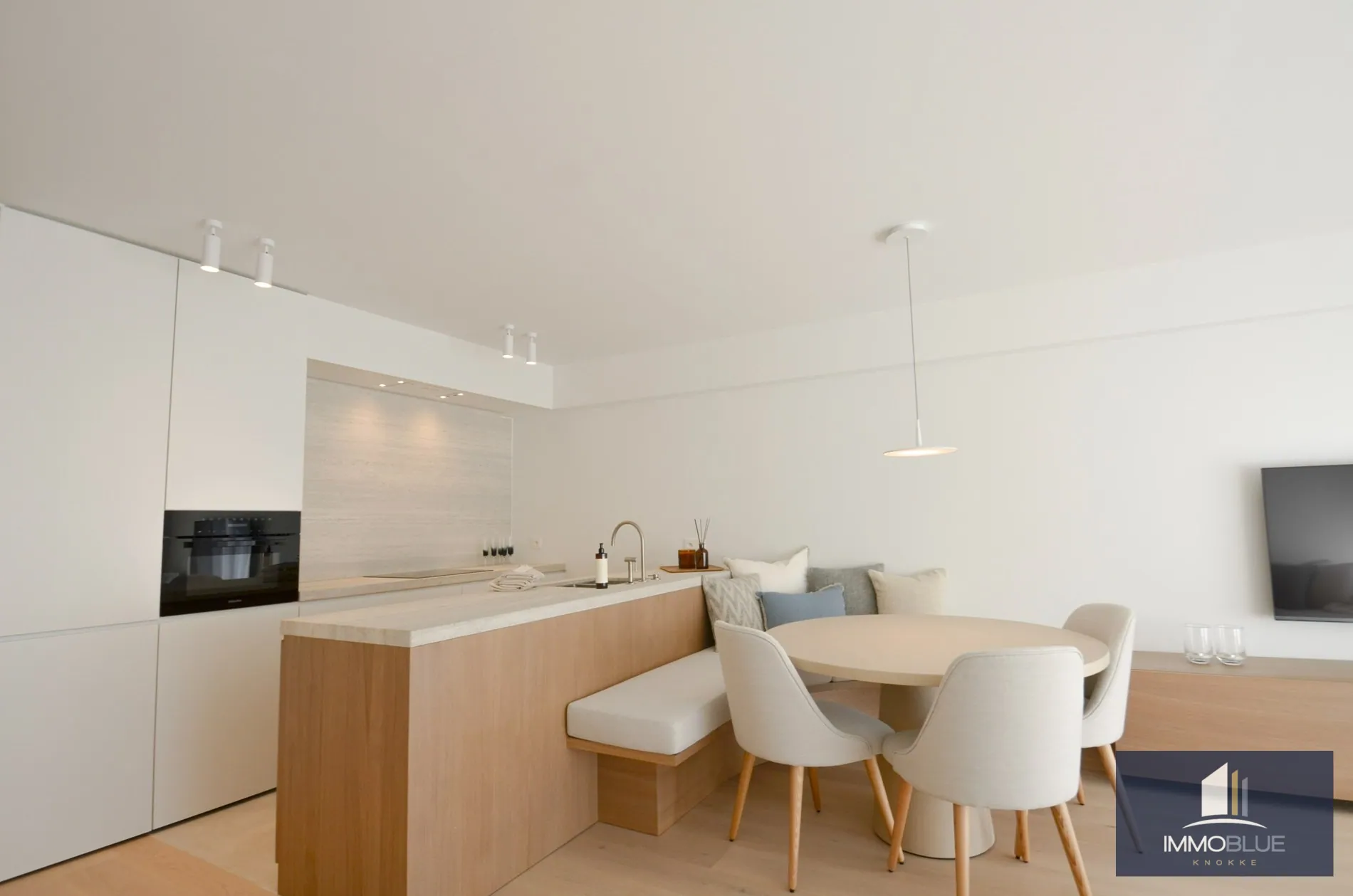 Lichtrijke leefruimte met een volledig uitgeruste open keuken, voorzien van alle comfort. Aansluitend bevinden zich een gezellige eethoek en een salon die uitgeven op het terras aan de voorzijde.