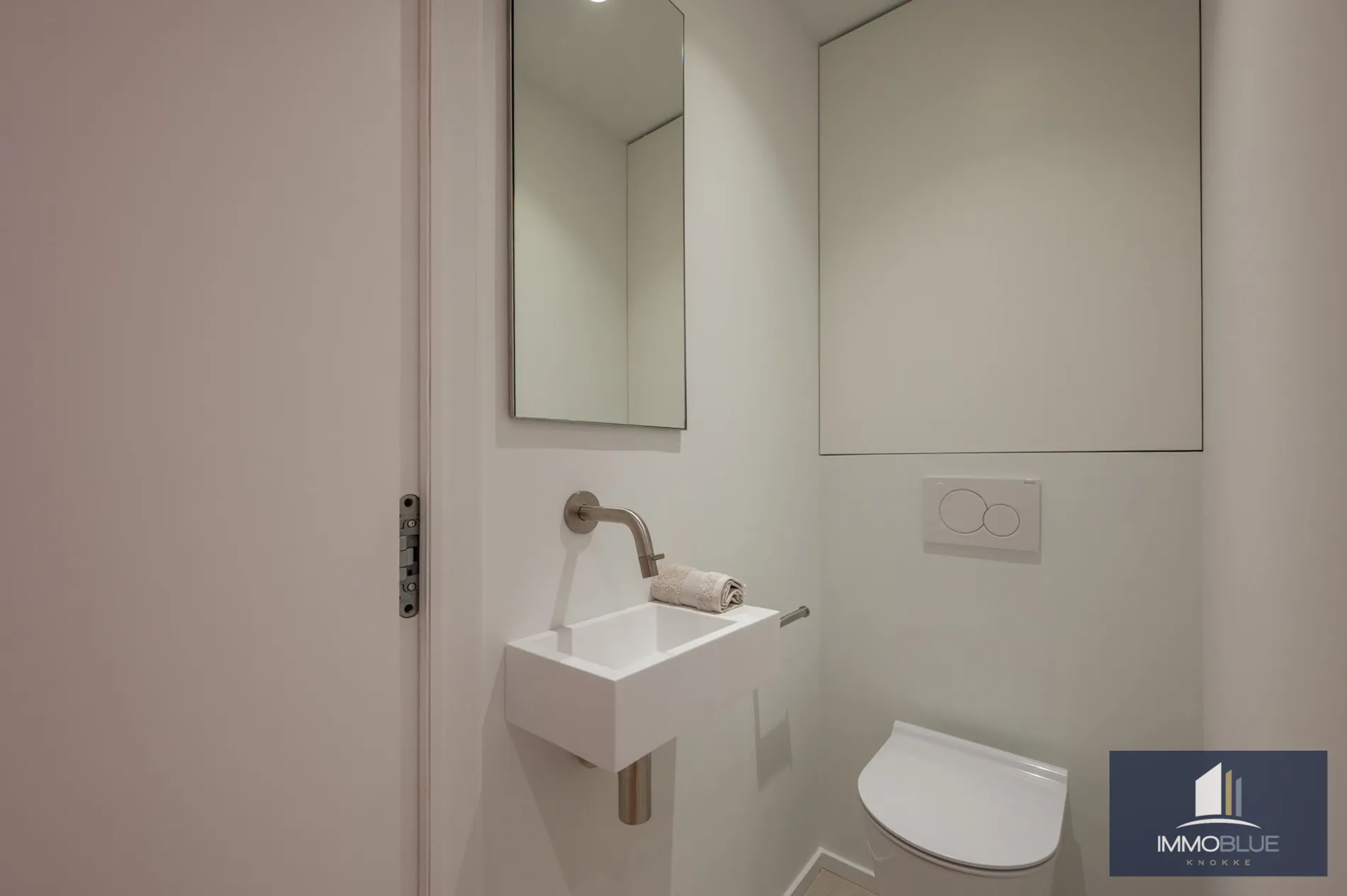 De inkomhal beschikt over een gastentoilet en praktische ingemaakte kasten. De lichtrijke, gezellige en comfortabele leefruimte sluit naadloos aan op een tijdloze, volledig geïnstalleerde open keuken, uitgerust met alle hedendaags comfort. Aansluitend bevindt zich een zeer ruime berging, voorzien van aansluitingen voor wasmachine en droogkast en extra opbergruimte.