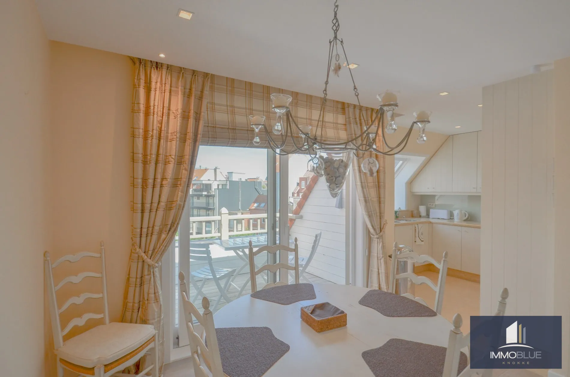 Halfopen keuken met aangrenzende eethoek, uitgevend op het tweede terras achteraan voorzien van berging.