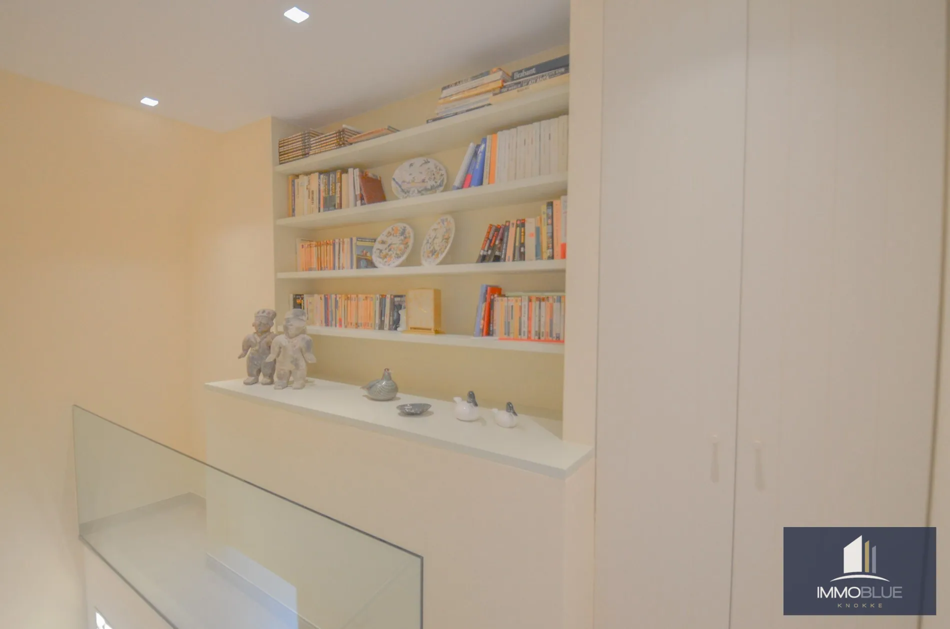 Inkomhal met gastentoilet en vestiaire. Gezellige, lichtrijke leefruimte met open haard en ingemaakte kasten, waarvan één ingericht als bar. De woonkamer geeft uit op het ruime zonneterras aan de voorzijde, uitgerust met bergingen en een zonneluifel. Vanuit het salon geniet u van een prachtig panoramisch zicht. Aparte bergingen, waarvan één voorzien voor wasmachine.