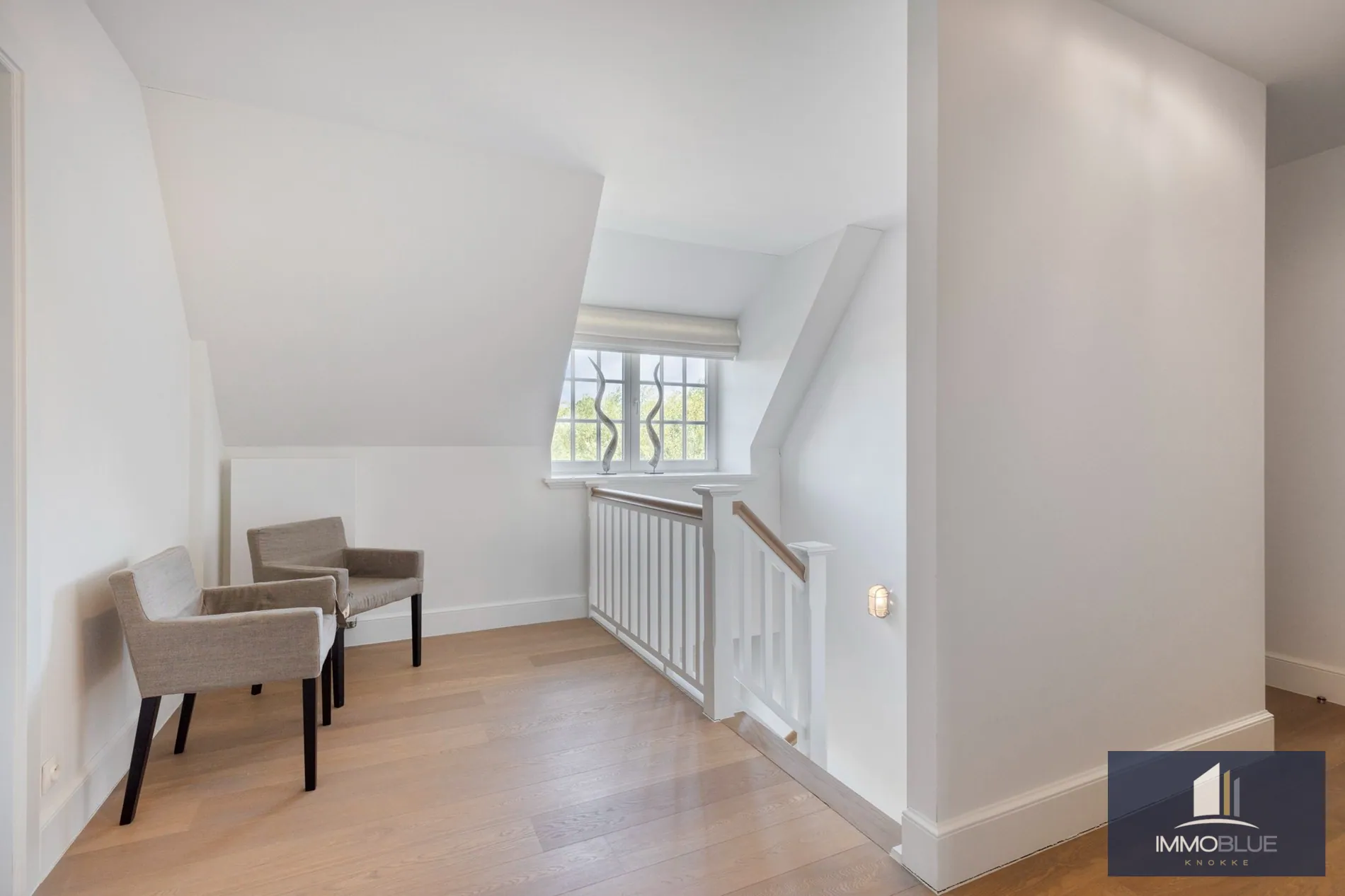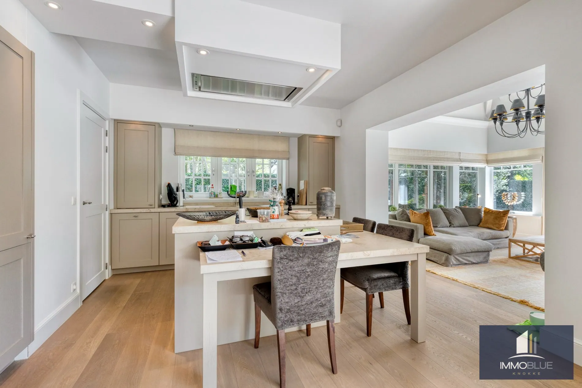 Luxueuze en stijlvolle villa in Engelse Cottage stijl met verwarmd zwembad gelegen nabij de Royal Zoute Golf Club en de zee op een totale oppervlakte van 1045m². Indeling: Inkomhal met vestiaire en gastentoilet. Ruime woonkamer bestaande uit een eetkamer en salon voorzien van een gashaard, bureelruimte uitgevend op het zuidgericht terras en tuin. Ruime keuken met aanpalend een family room en bijkeuken. Verwarmd zwembad .