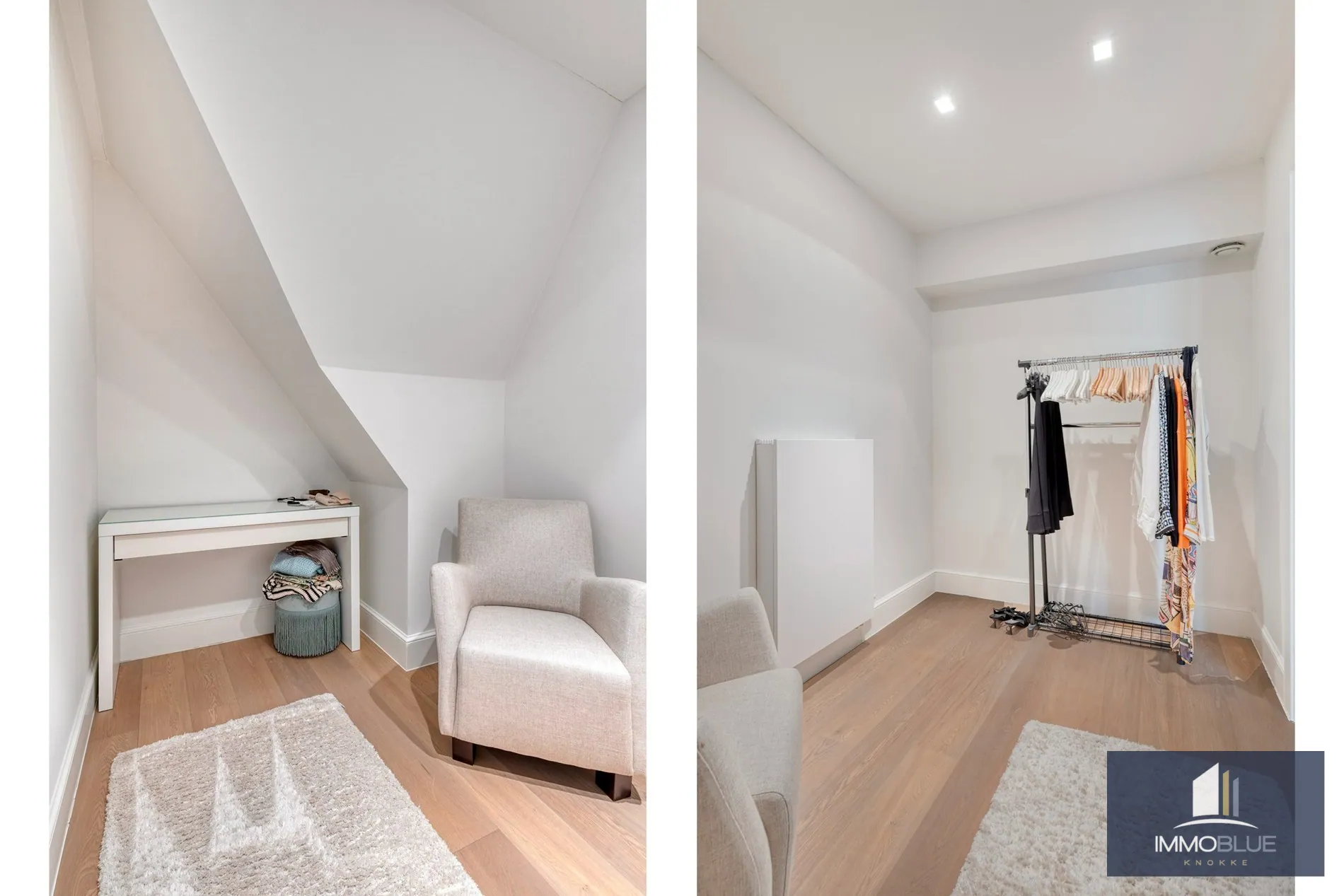 Eerste verdieping: Nachthal met berging en linnenkast. Masterbedroom met zuidgericht terras, dressing en ruime badkamer. Twee volwaardige slaapkamers met badkamer, douchekamer en extra dressing.