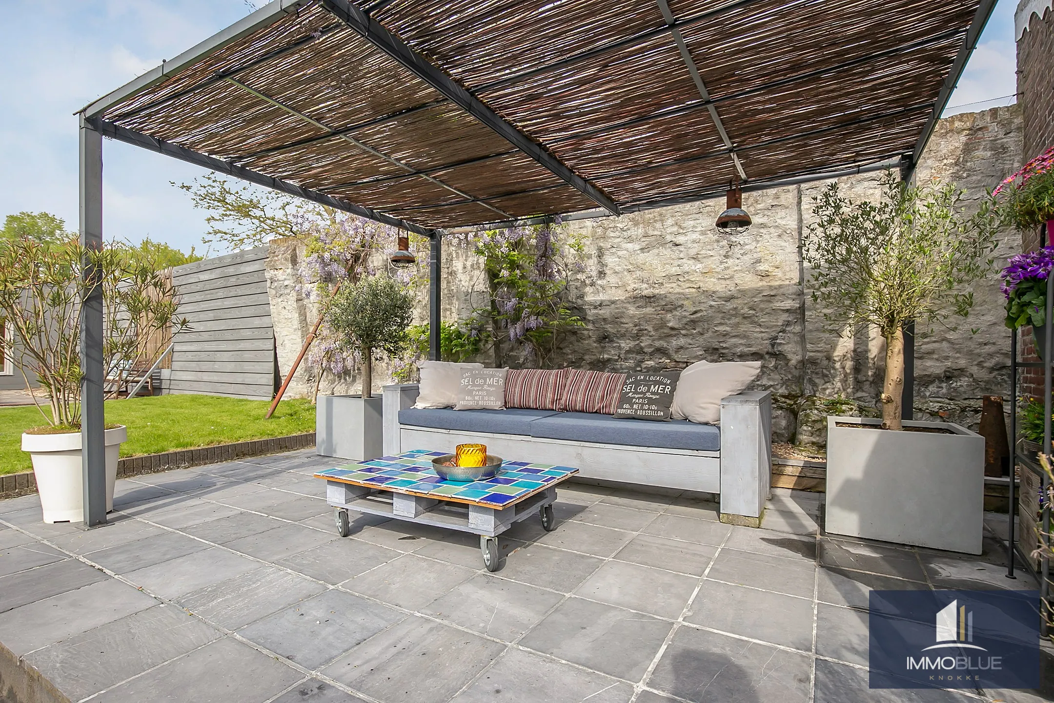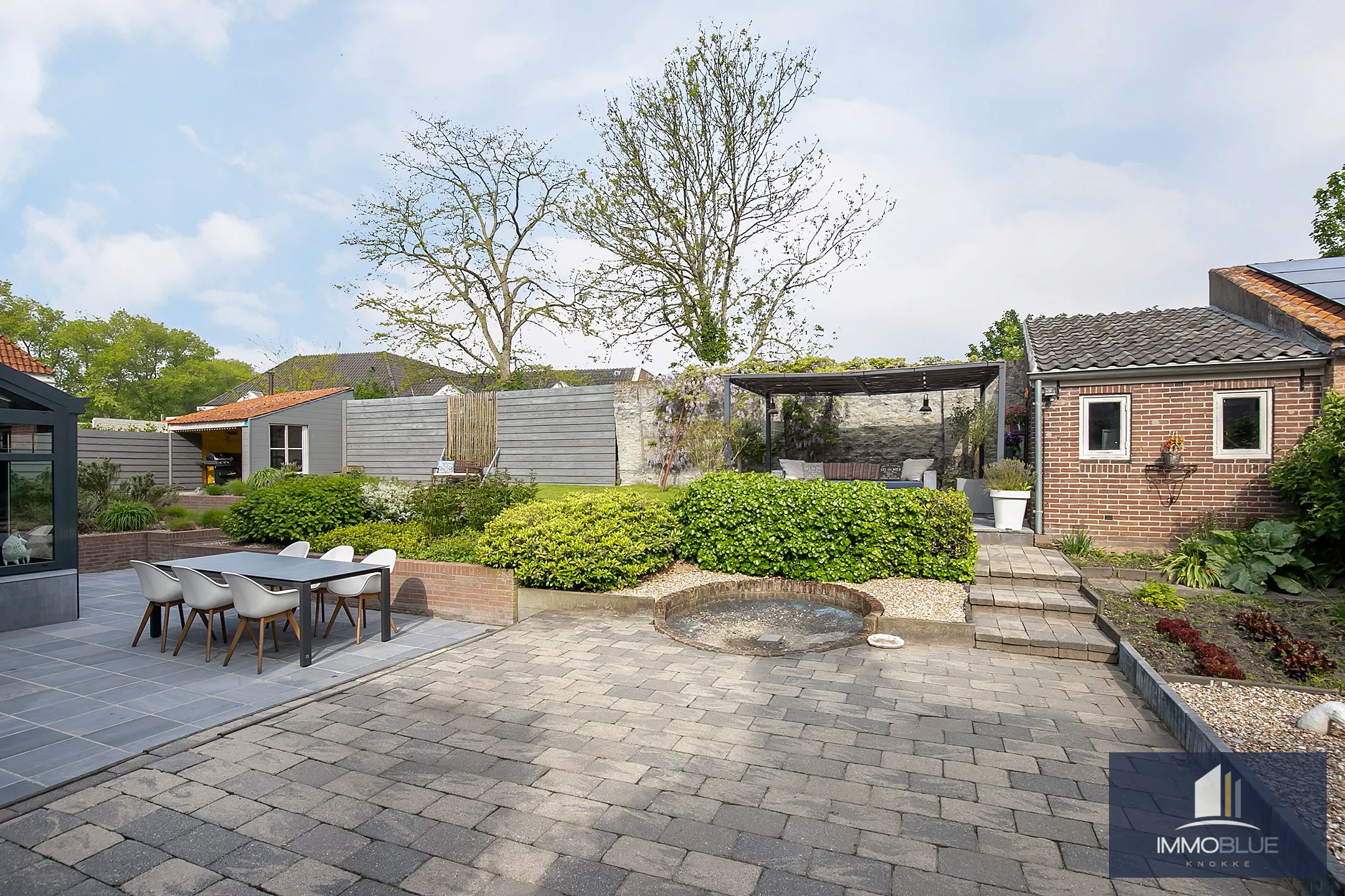 De zonnige tuin voorzien van verlichting en terrassen.