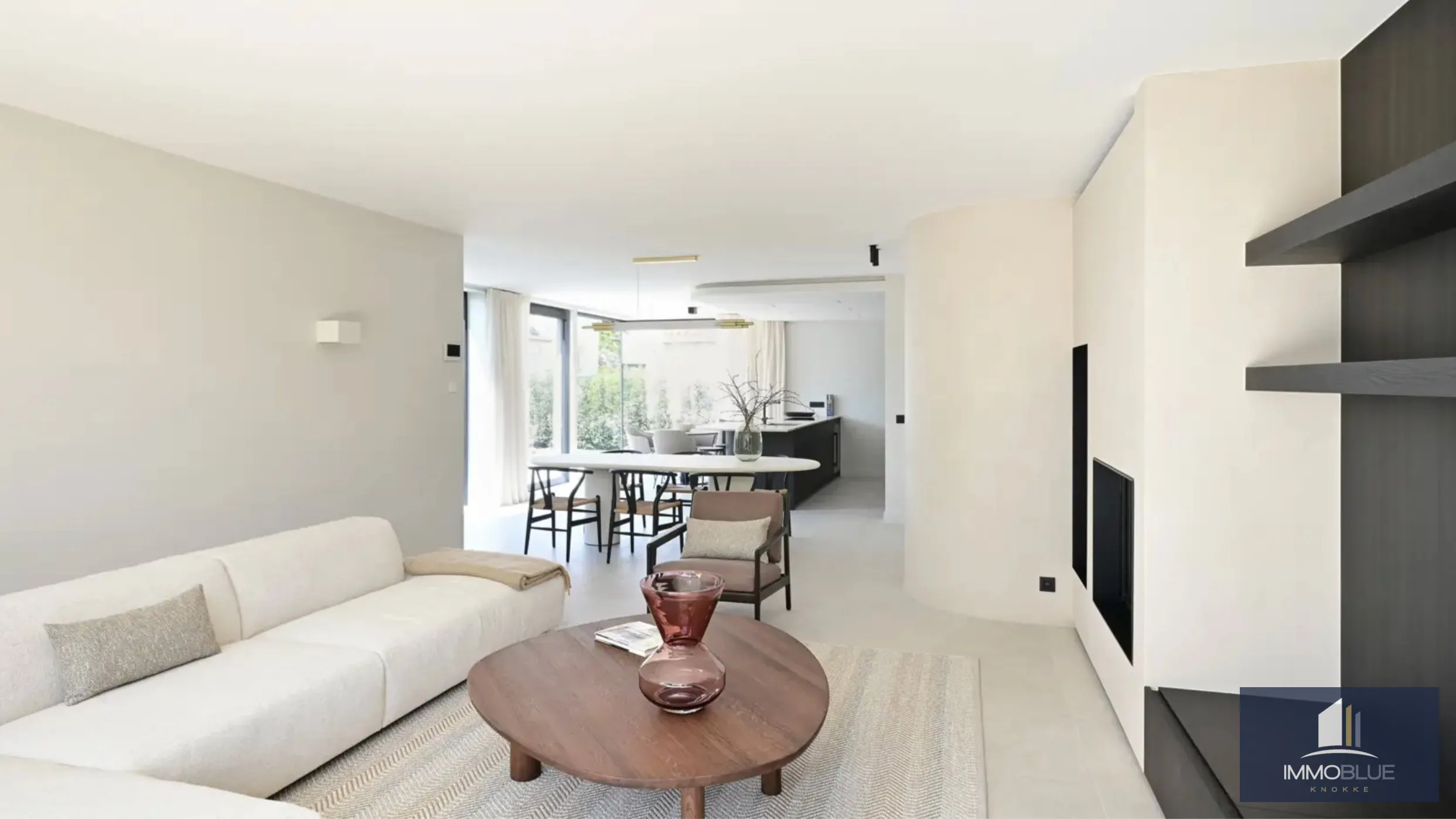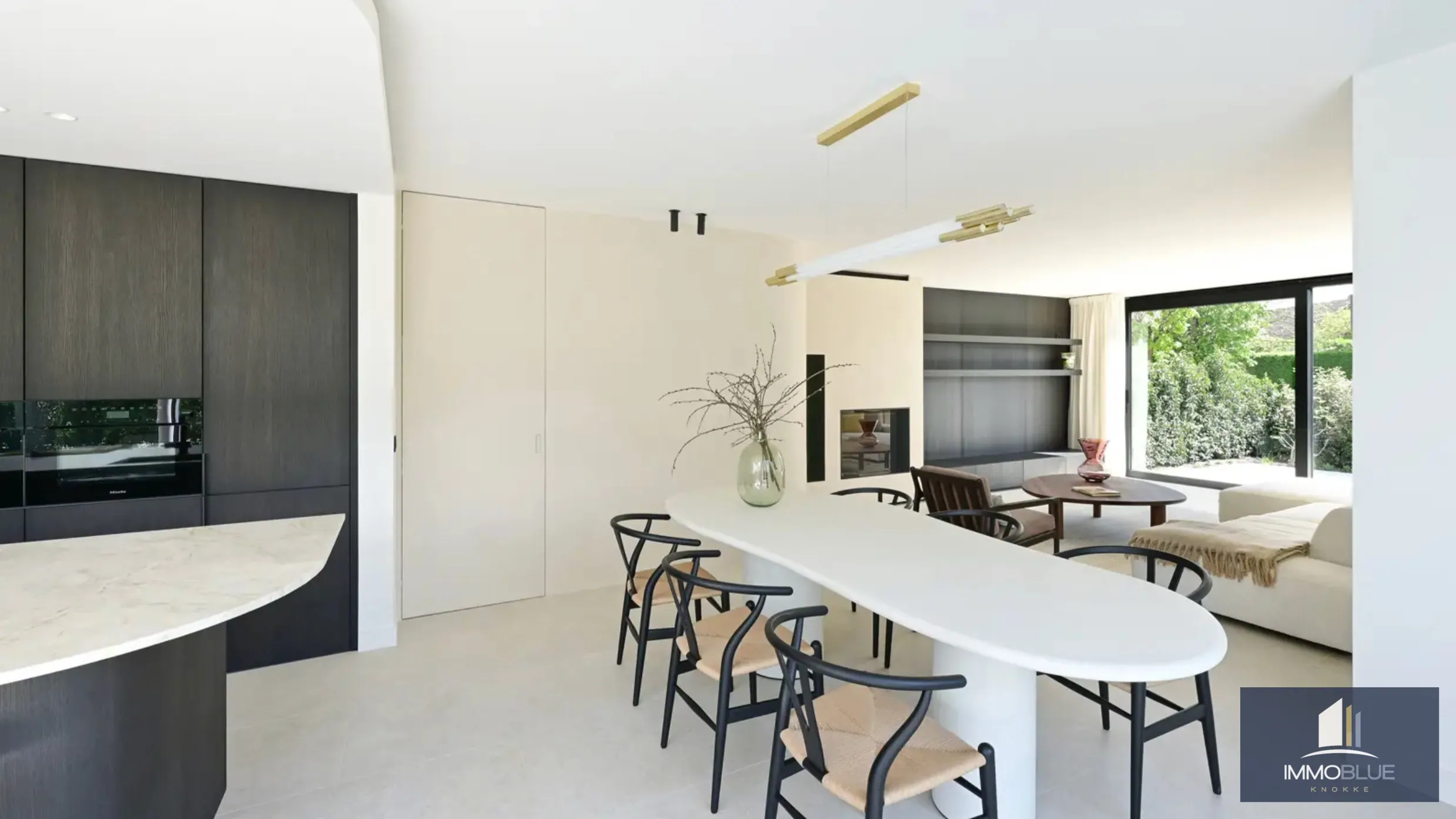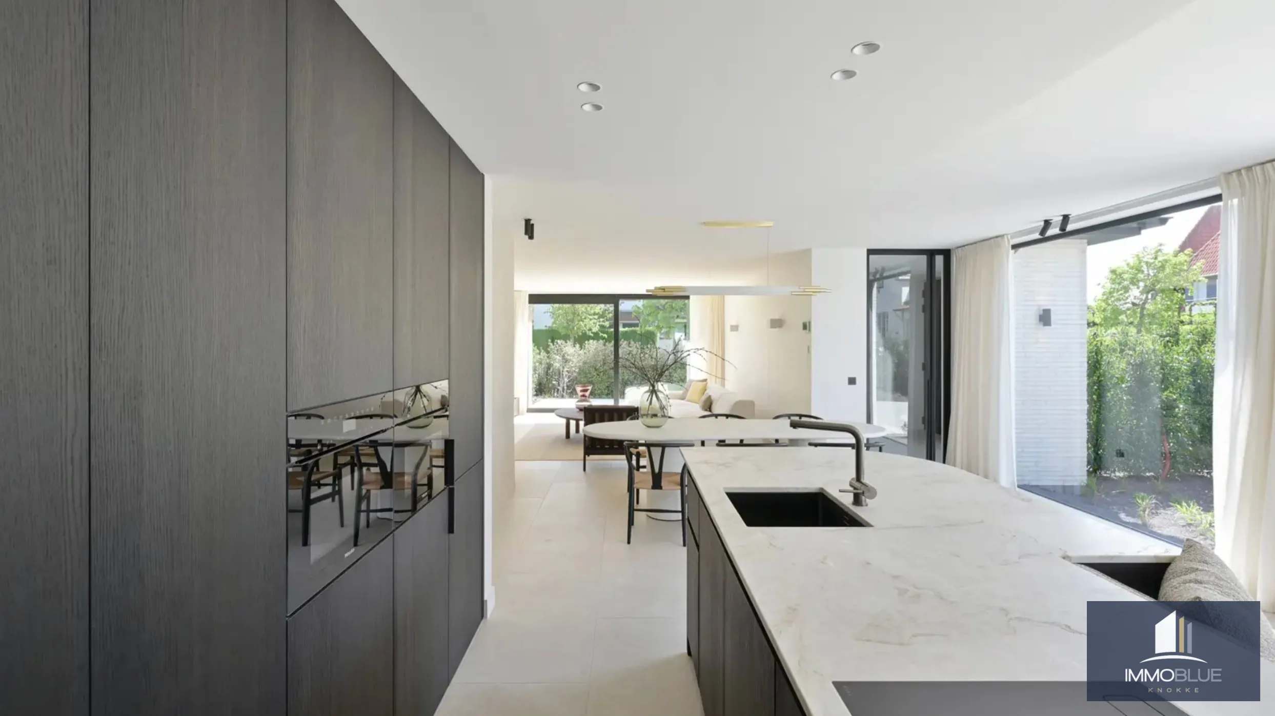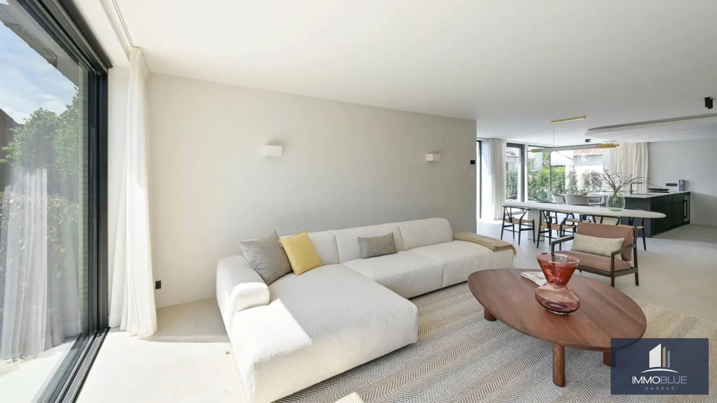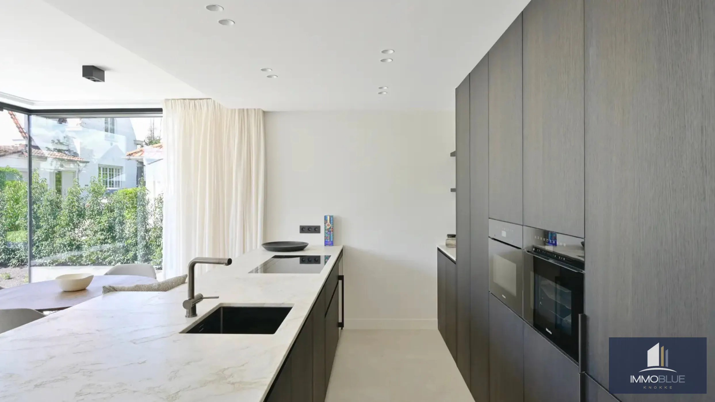 Deze unieke en rustig gelegen nieuwbouw koppelvilla met 6 volwaardige slaapkamers bevindt zich nabij de Zeedijk en vlakbij het centrum van Knokke. Duurzaamheid is een kernwaarde in deze woning, met een voortreffelijk E-peil (E19 – BEN woning) als bewijs. De woning is o.a. uitgerust met een warmtepomp (geothermie), meerdere zonnepanelen, ventilatiesysteem type C+, vloerverwarming met koelfunctie op 3 verdiepingen, laadpaal voor elektrische voertuigen, bewakingscamera, regenwaterput van 5000 liter, ... Het volledige interieur van de woning werd ontworpen door de interieurarchitect Bryan Chielens. Bovendien is er een mogelijkheid tot het aankopen van het meubilair, dat geleverd werd door RR interieur Knokke-Heist. Indeling van gelijkvloers: inkomhal met gastentoilet. Zeer lichtrijke leefruimte met grote raampartijen die toegang bieden tot de zonovergoten, en onderhoudsvriendelijke tuin met 2 terrassen en tuin/fietsenberging, aangelegd door ECO Tuinarchitectengroep. Luxueuze en volledig geïnstalleerde open keuken die voorzien is van Miele-toestellen. Aanpalende bergruimte met aansluitingen voor een wasmachine en droogkast. Indeling van 1e verdiep: nachthal met apart toilet. Op dit niveau bevindt zich de master bedroom, voorzien van verschillende ingemaakte kasten, en met een luxueuze douchekamer (voorzien van inloopdouche en dubbele lavabo). Daarnaast zijn er nog 2 volwaardige slaapkamers met verschillende ingemaakte kasten en bureau, met telkens een douchekamer en suite. Indeling van 2e verdiep: nachthal met apart toilet. Op dit niveau bevinden zich 3 volwaardige slaapkamers met ingemaakte kasten en bureau/berging. Daarnaast is er een aparte badkamer met een ligbad en wastafel. Grote zolderruimte. Gesplitste verkoop grond en constructie.