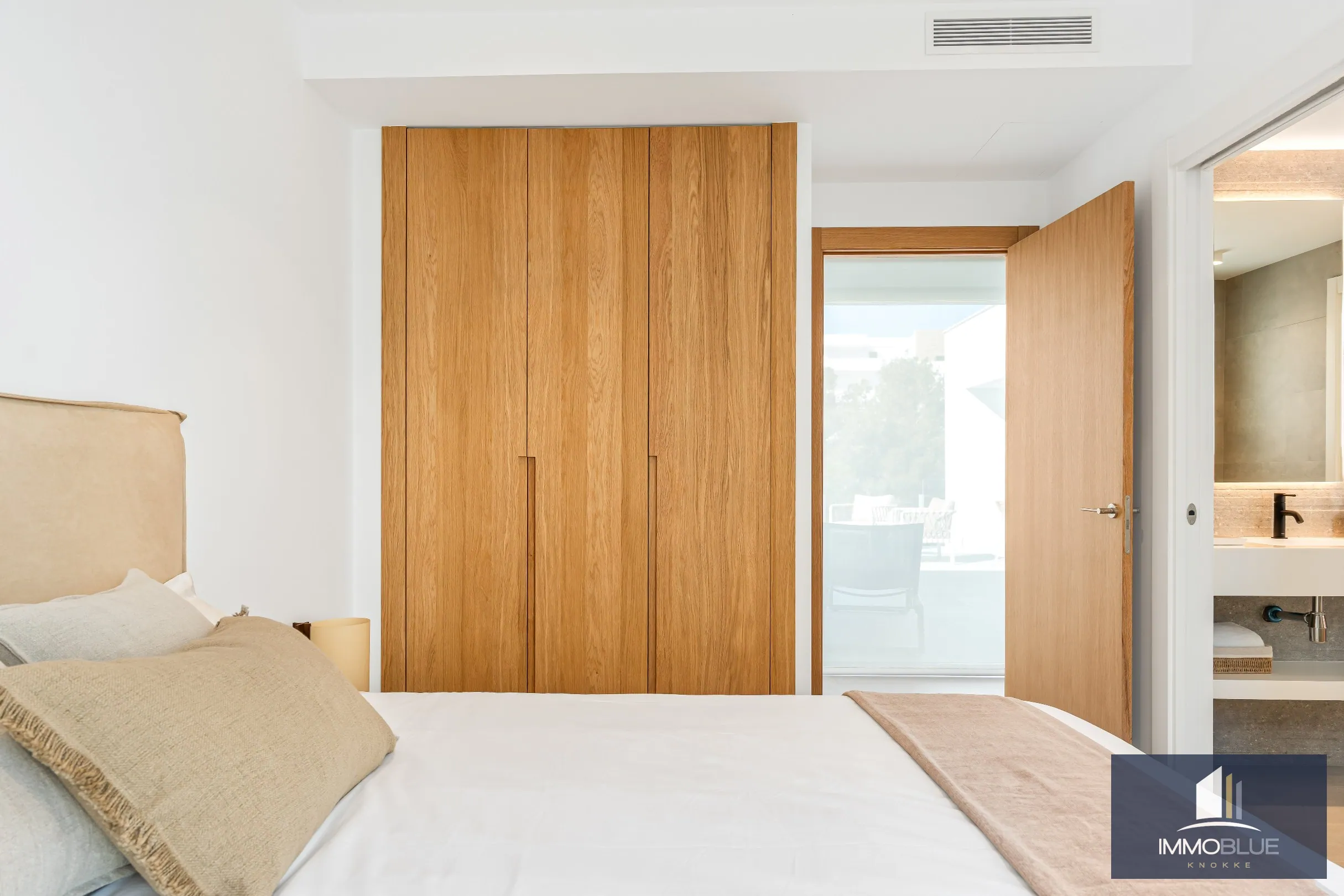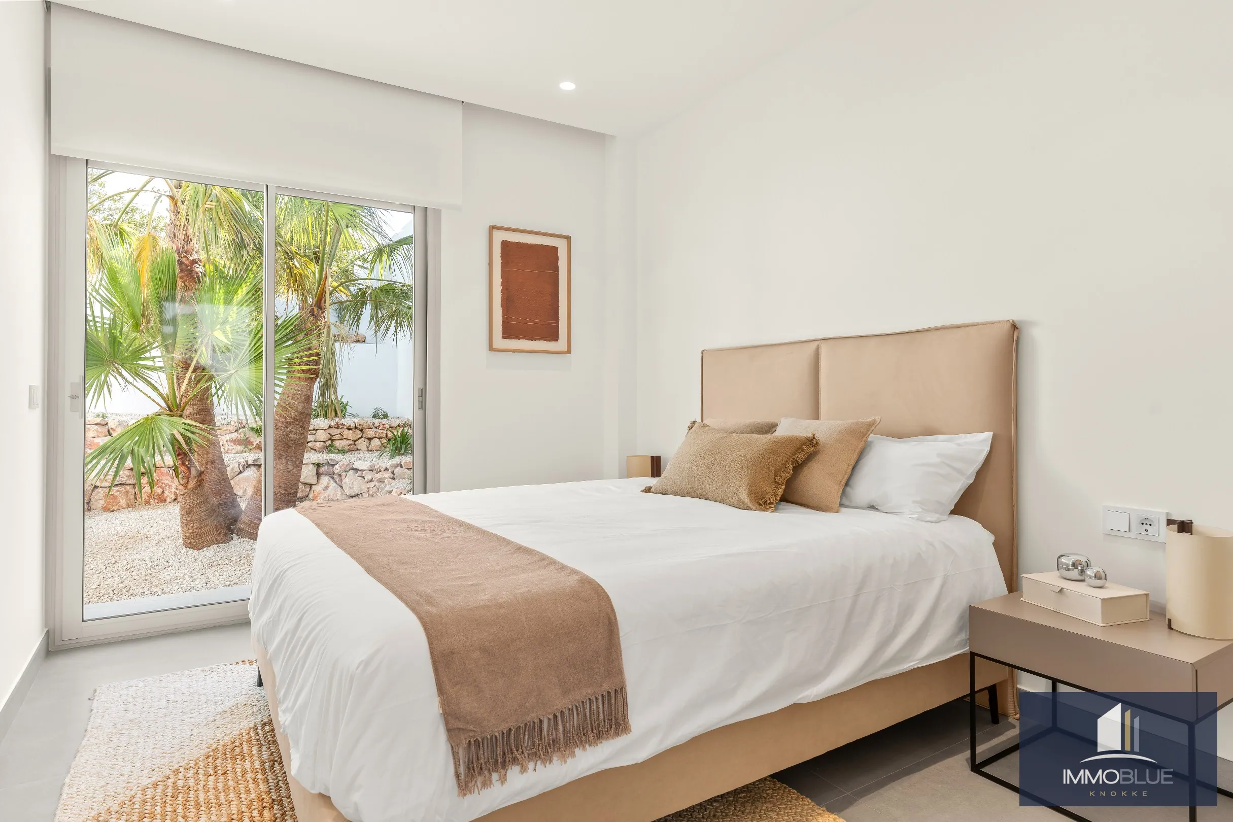 De hoofdverdieping omvat een open leefruimte met salon, eetkamer en keuken die rechtstreeks uitgeeft op het terras en het privézwembad. De slaapzone beschikt over vier tweepersoonsslaapkamers, waaronder een suite met privébadkamer en directe toegang tot het terras.