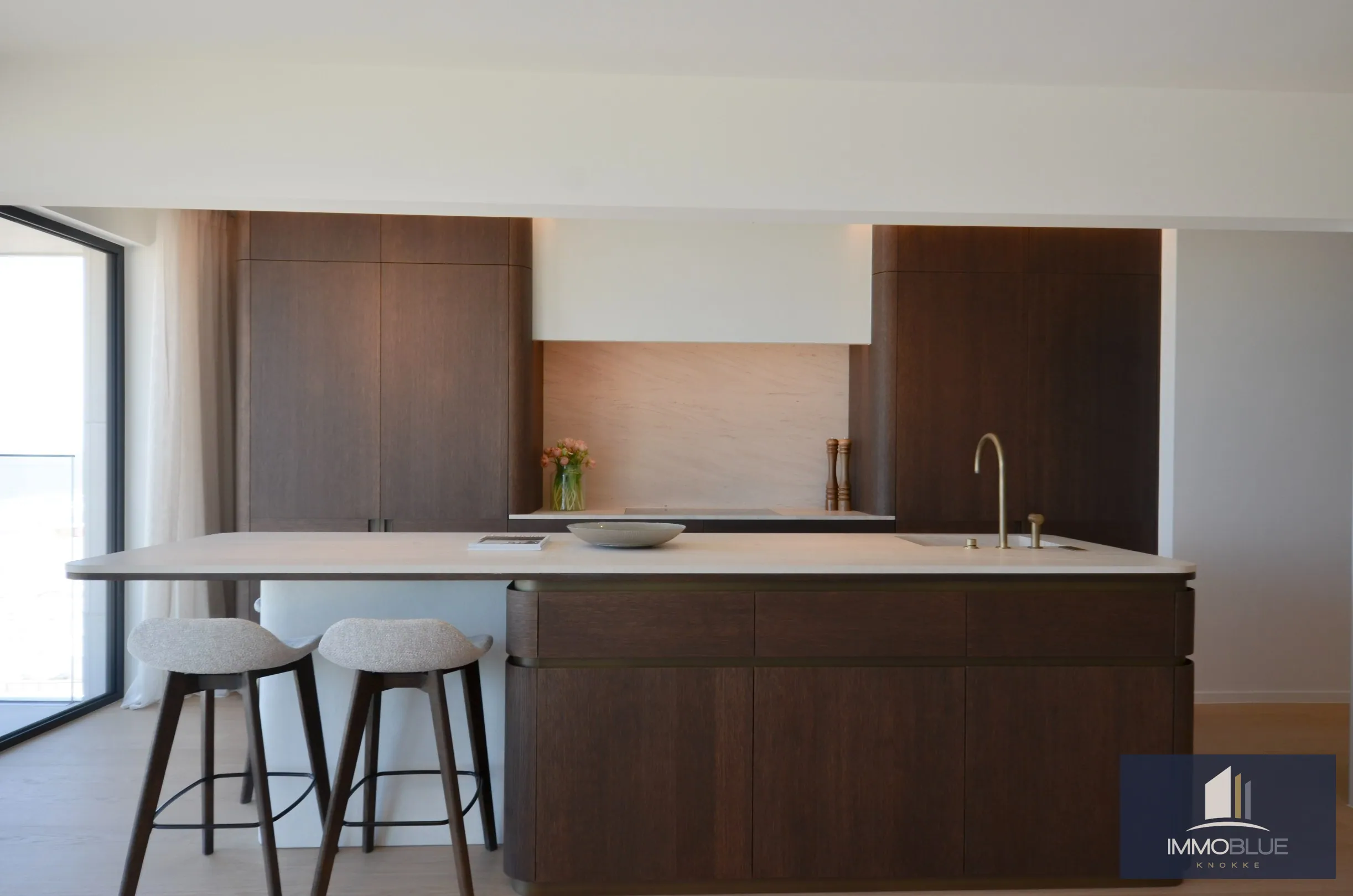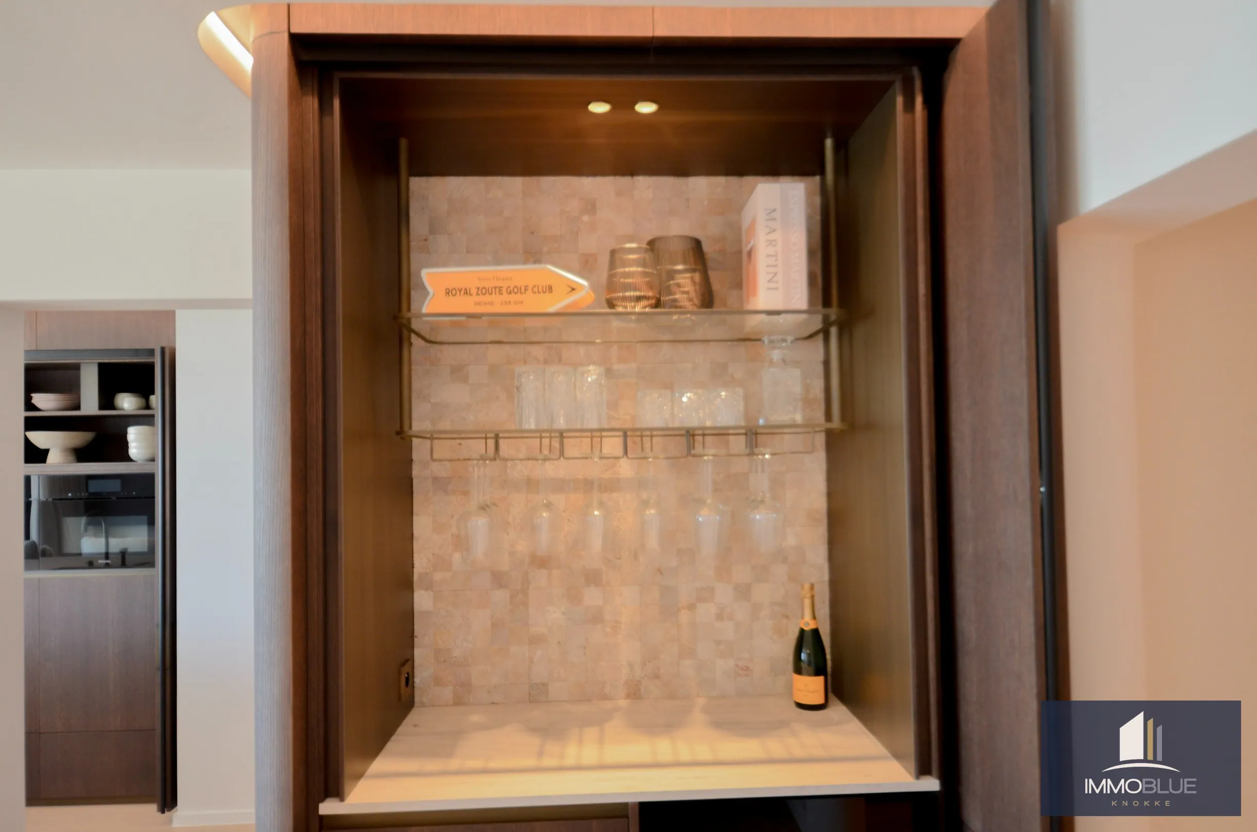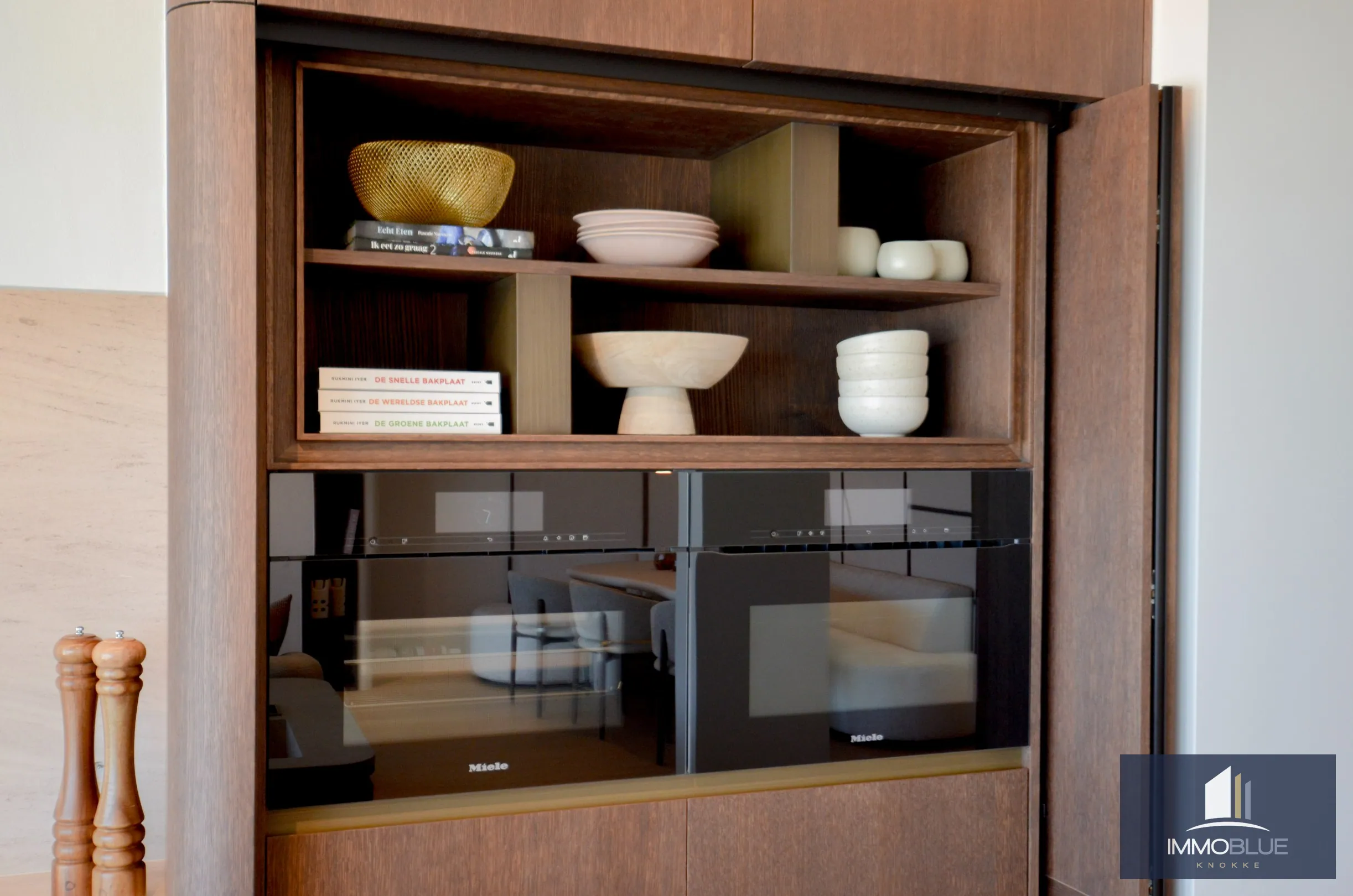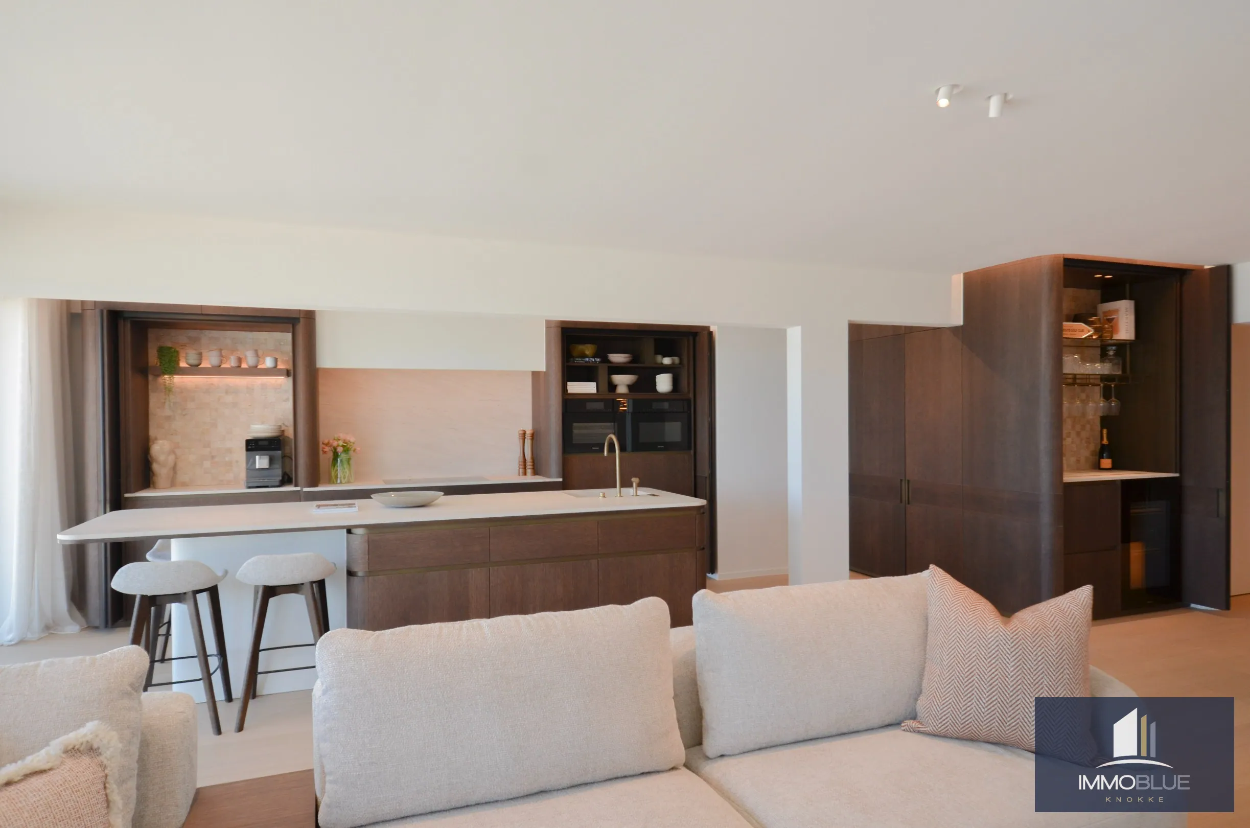 Een open, volledig uitgeruste keuken met keukeneiland en de nieuwste generatie toestellen zoals een stoomoven, combi-oven, wijnklimaatkast en een aparte koffiehoek.