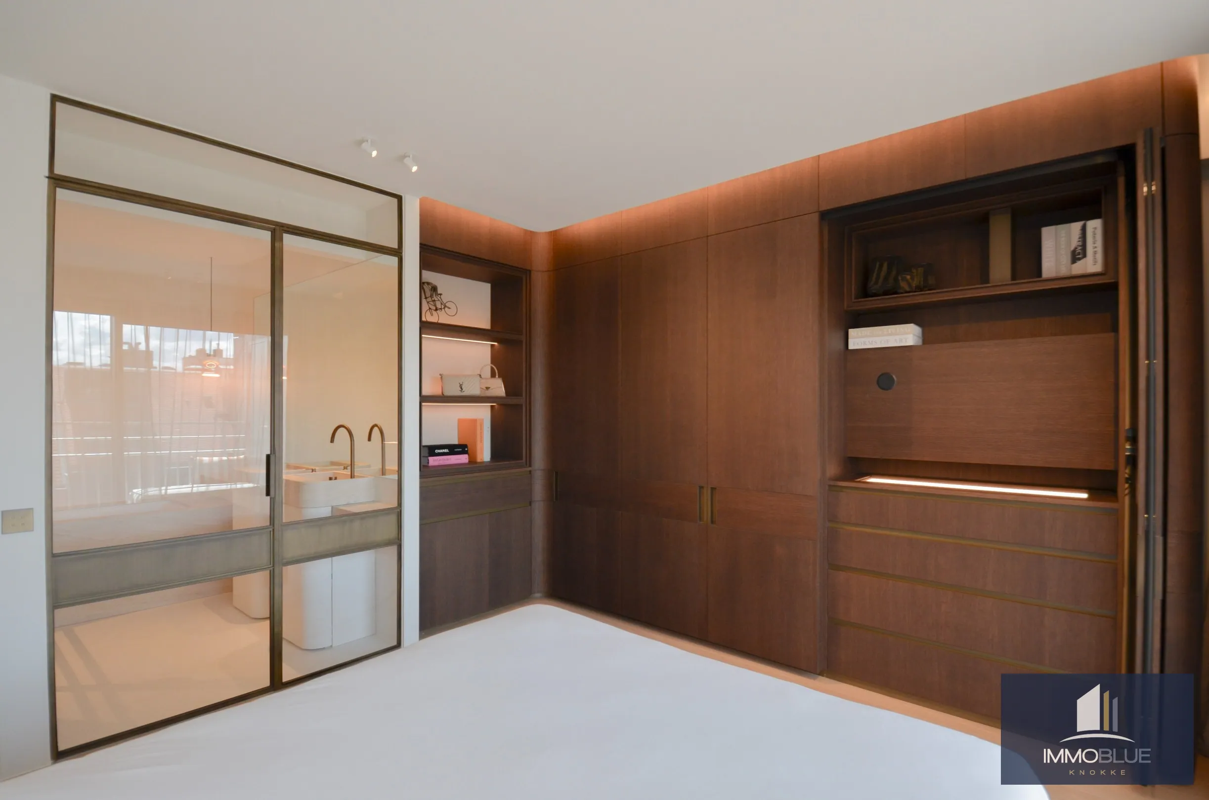 Master bedroom met ingemaakte kasten en een ensuite badkamer met ligbad, inloopdouche en dubbele wastafel.