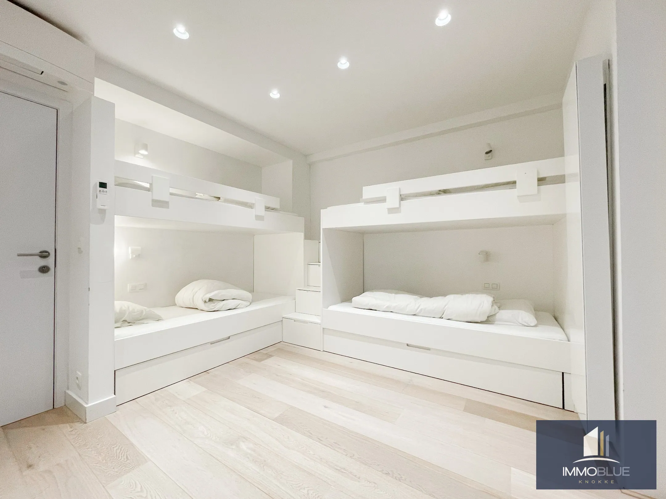 Suite parentale avec placards intégrés et espace bureau, attenante à la salle de bains. Deuxième chambre avec placards intégrés. Troisième chambre avec deux lits superposés encastrés et rangements intégrés. Salle de douche.