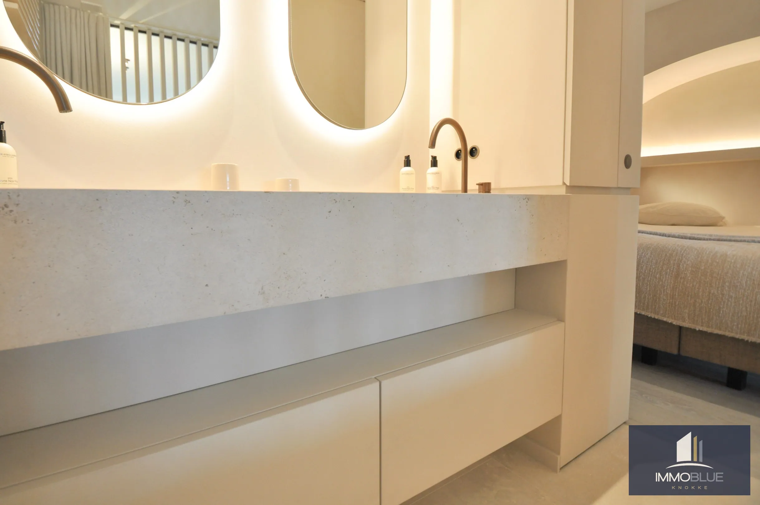 Chambre 1 : Équipée d’armoires encastrées, d’une salle de bain en suite avec toilettes séparées, et d’une vue sur la mer depuis la chambre ainsi que la salle de bain.