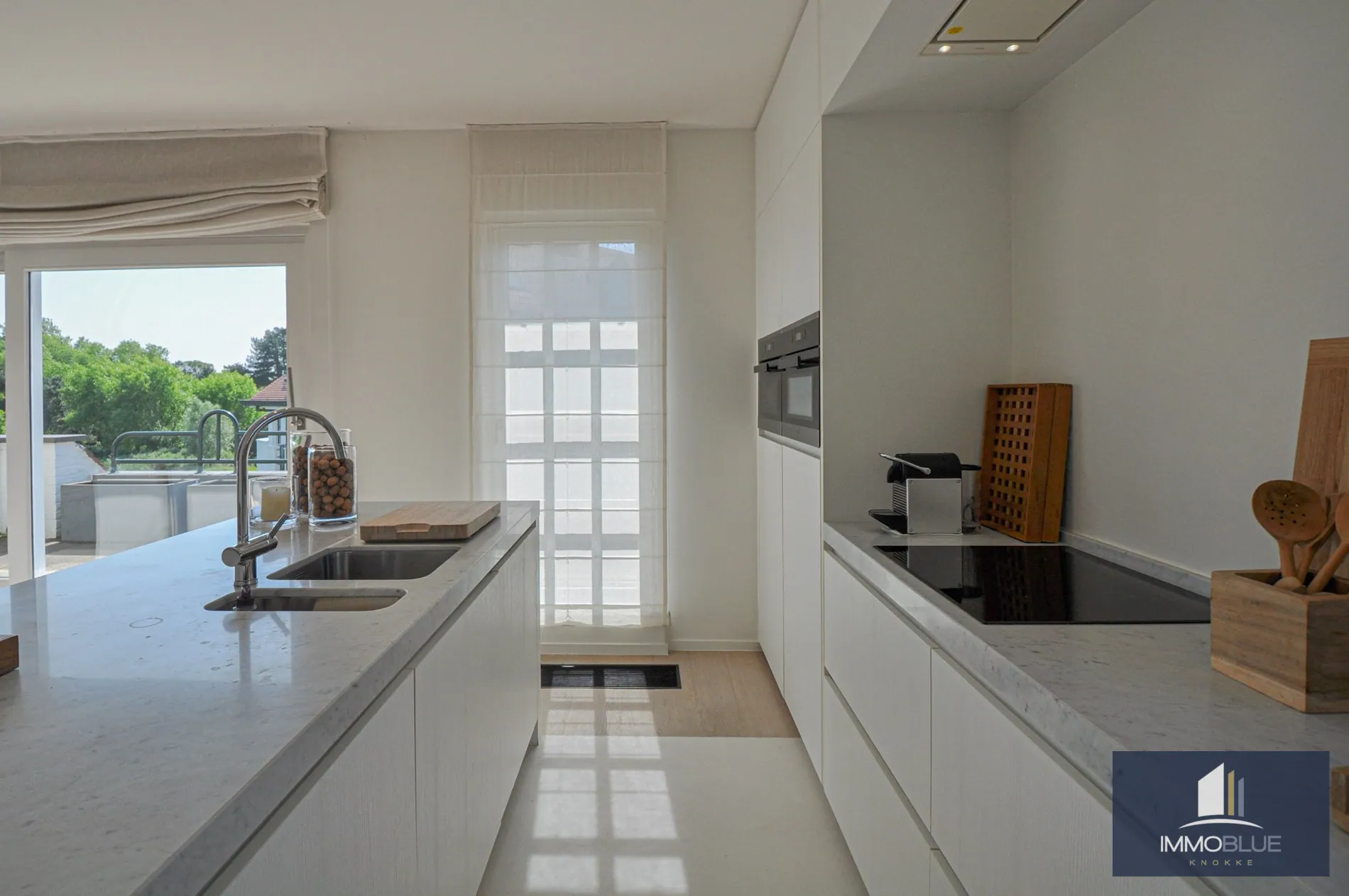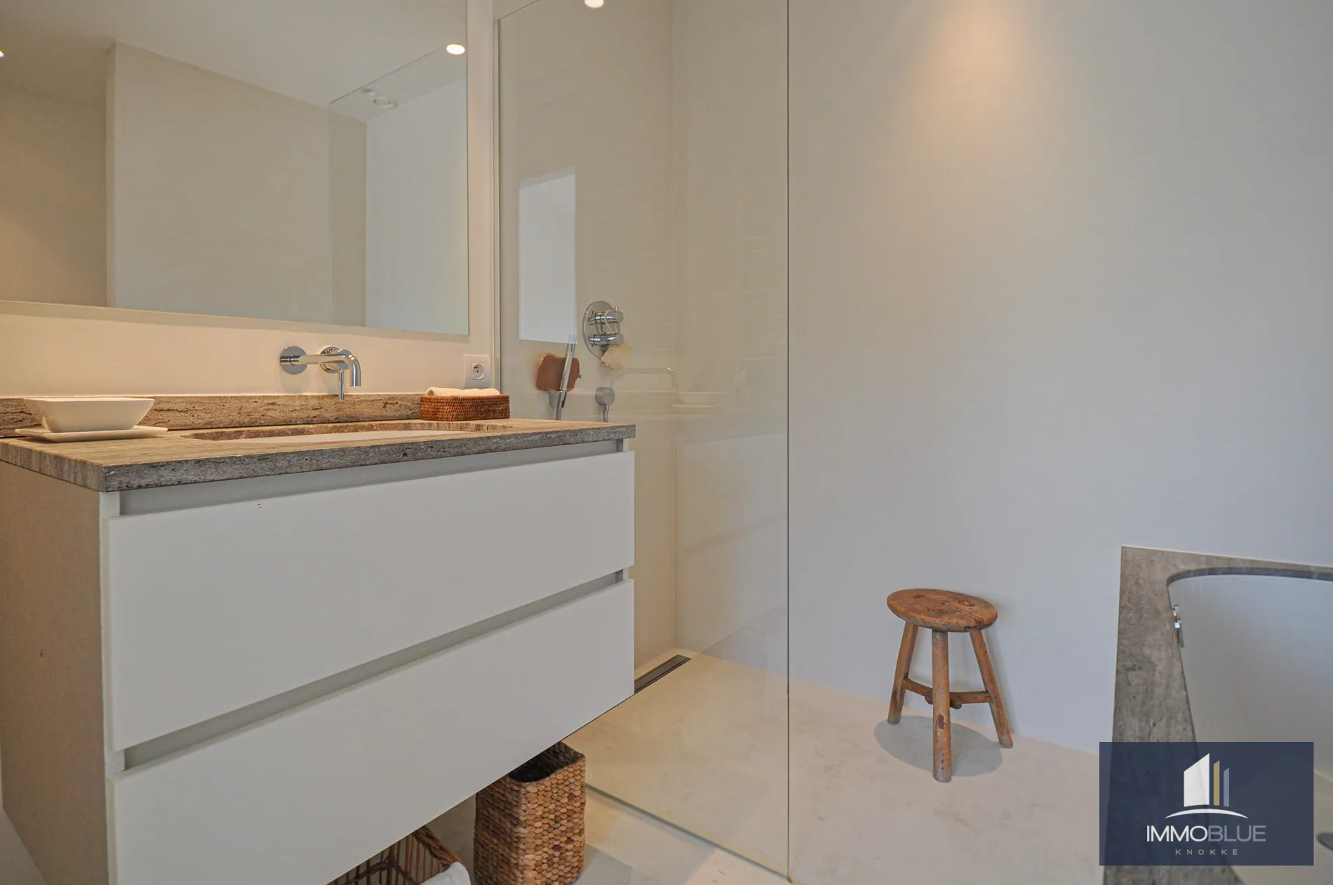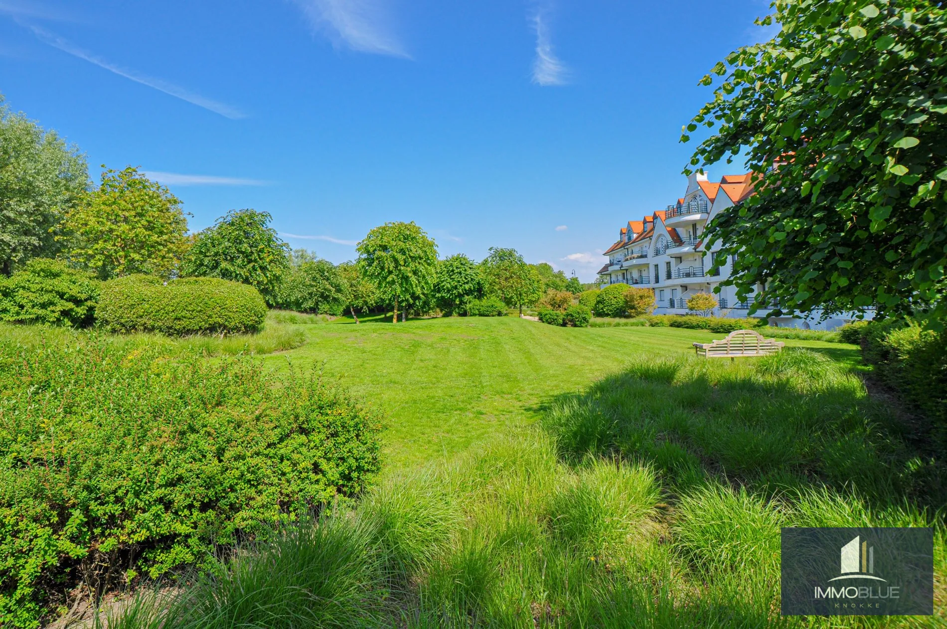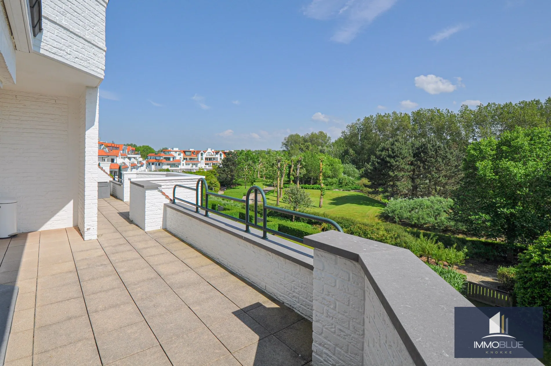 Cet appartement au style intemporel dispose de trois grandes terrasses offrant une vue splendide sur les jardins magnifiquement aménagés du domaine ainsi que sur le Royal Zoute Tennis Club.
