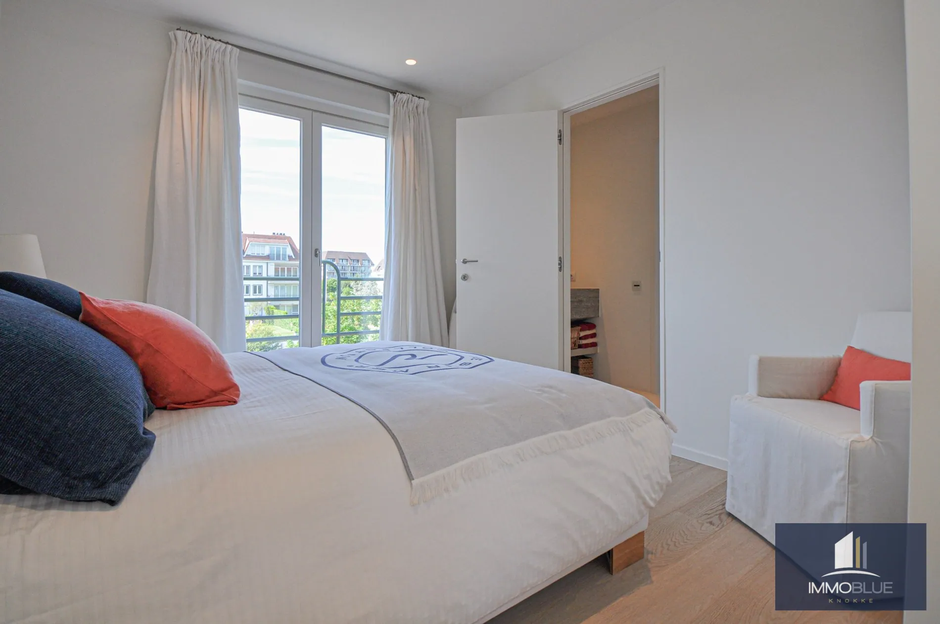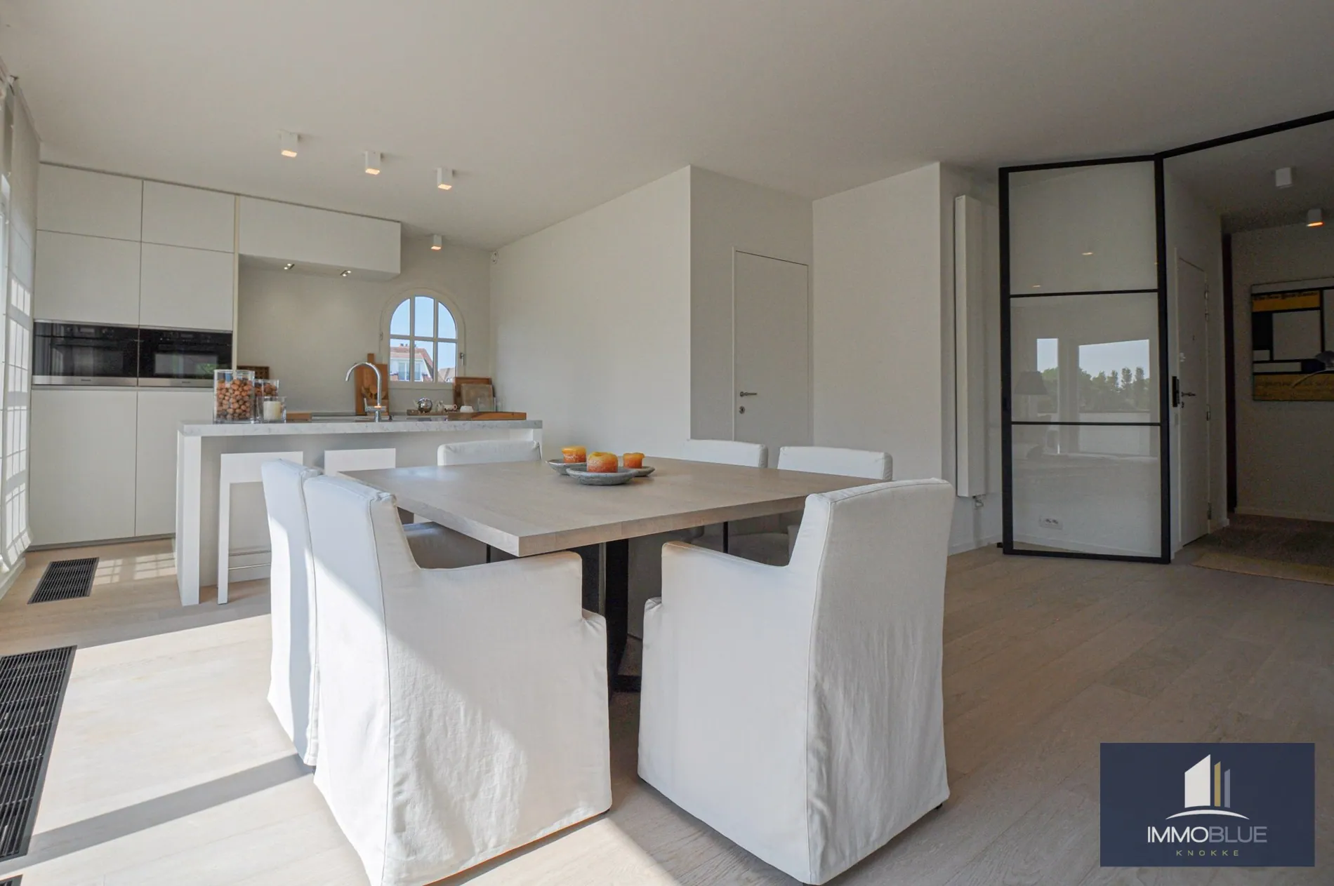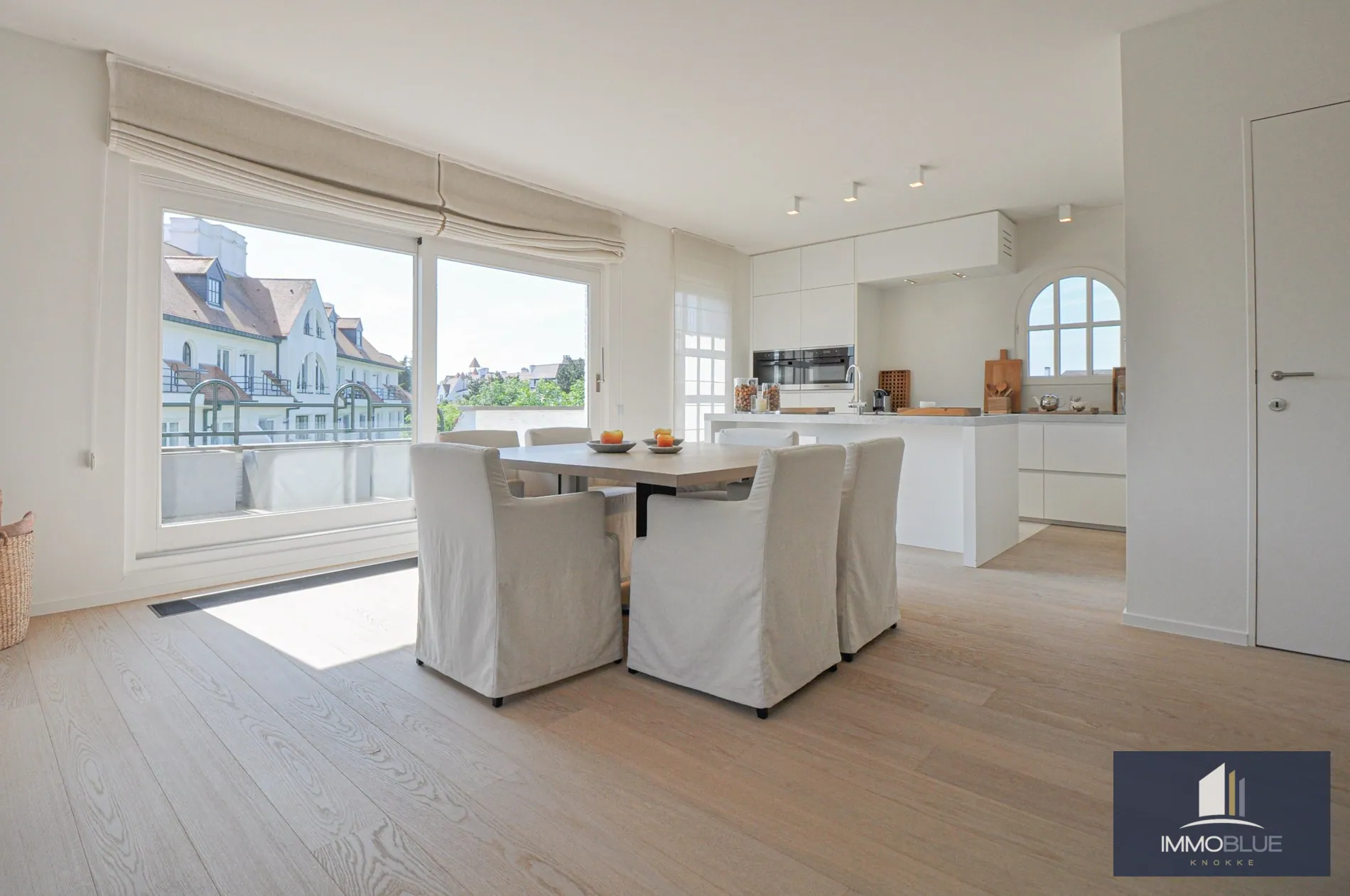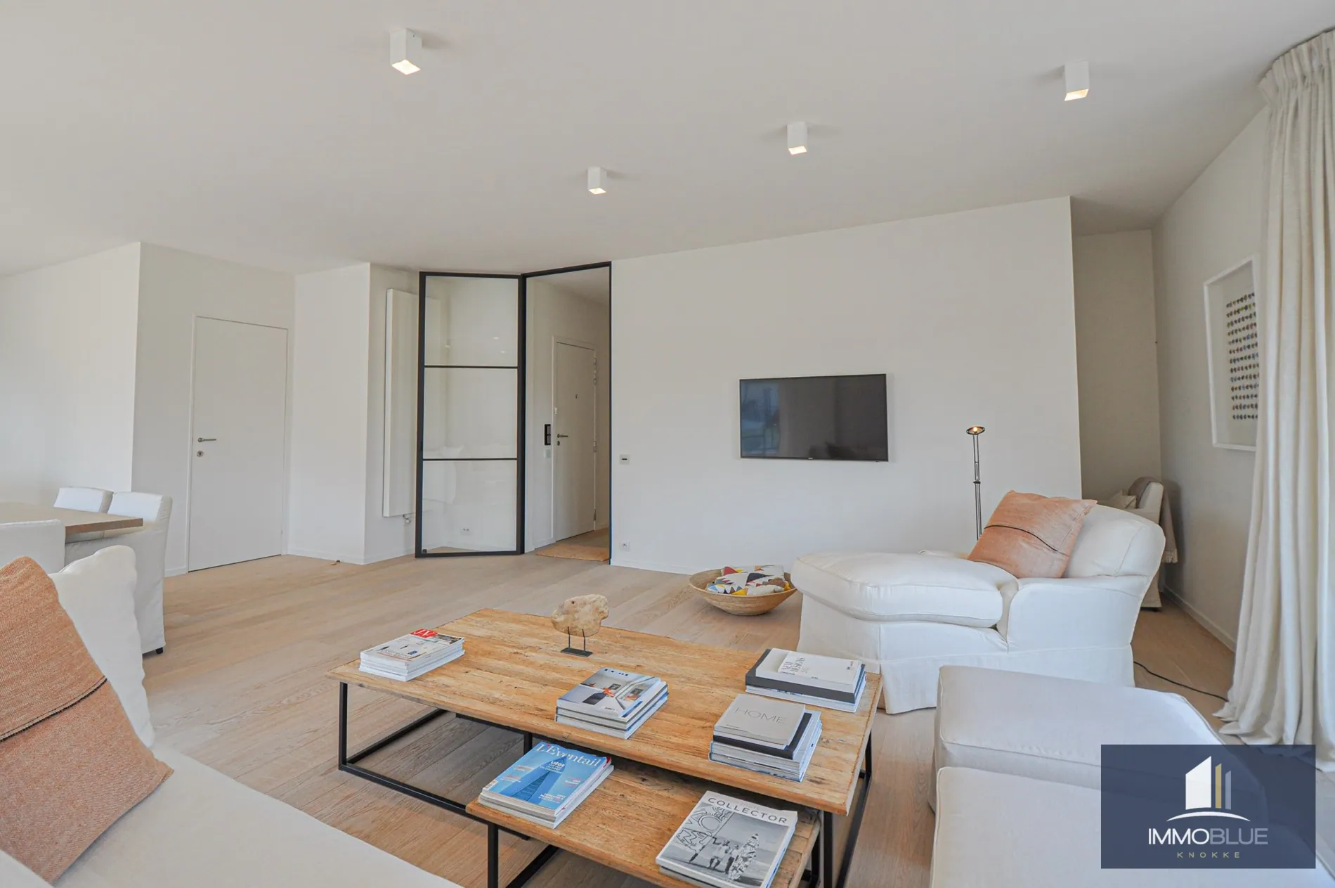 Cet appartement au style intemporel dispose de trois grandes terrasses offrant une vue splendide sur les jardins magnifiquement aménagés du domaine ainsi que sur le Royal Zoute Tennis Club.