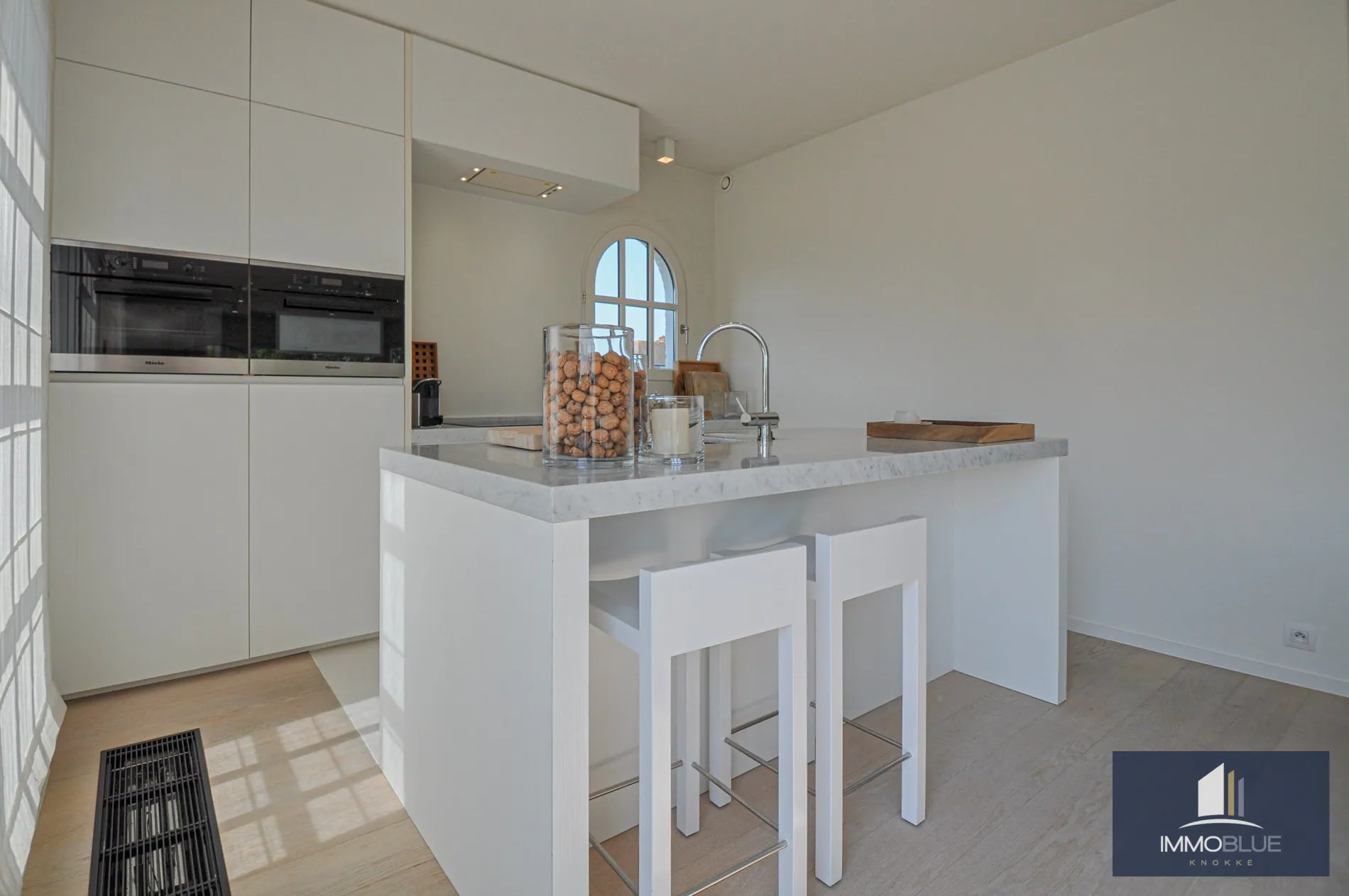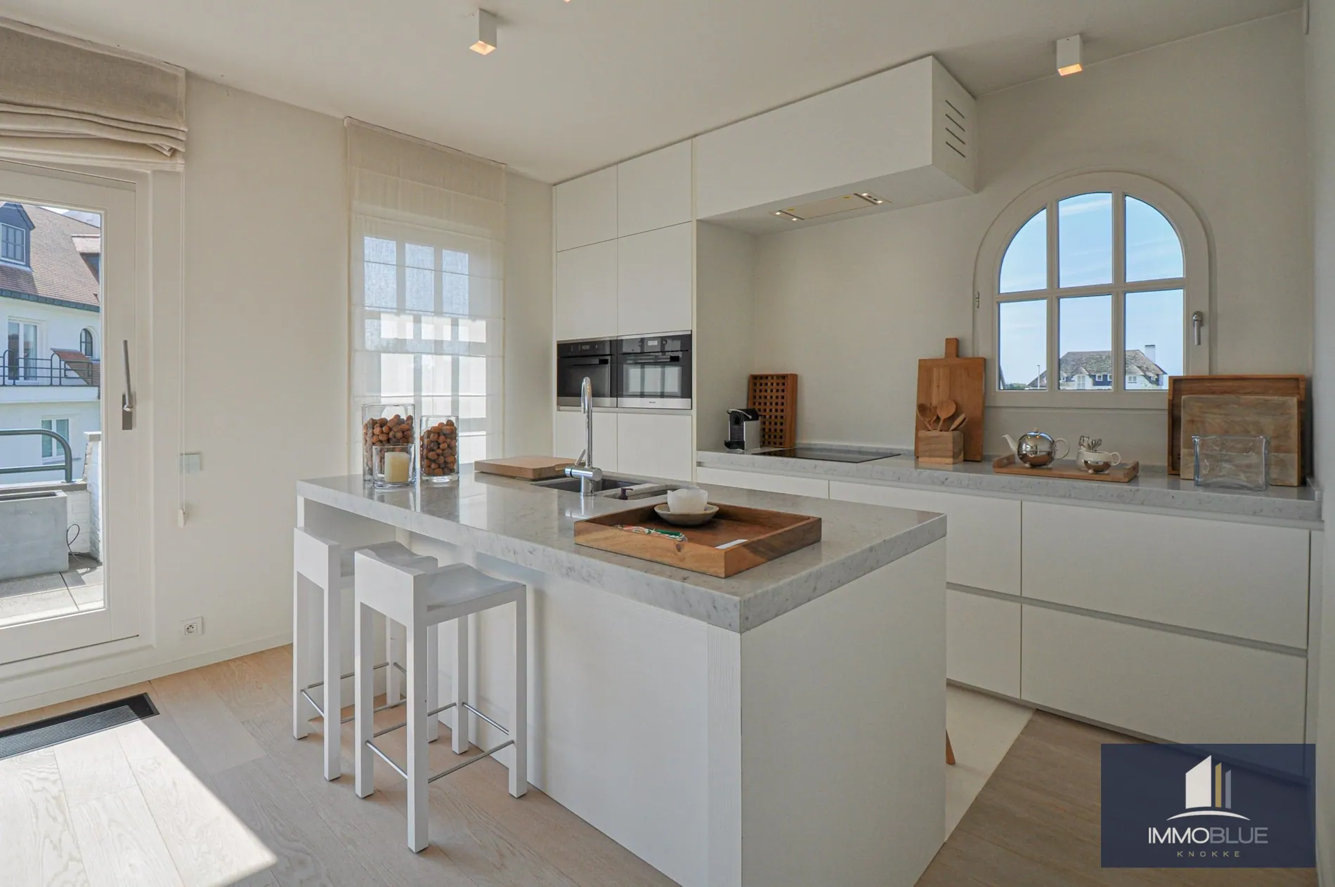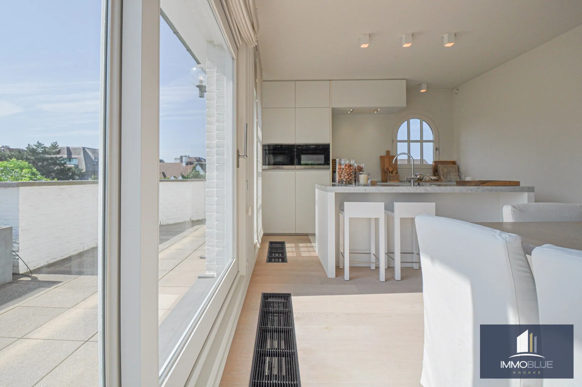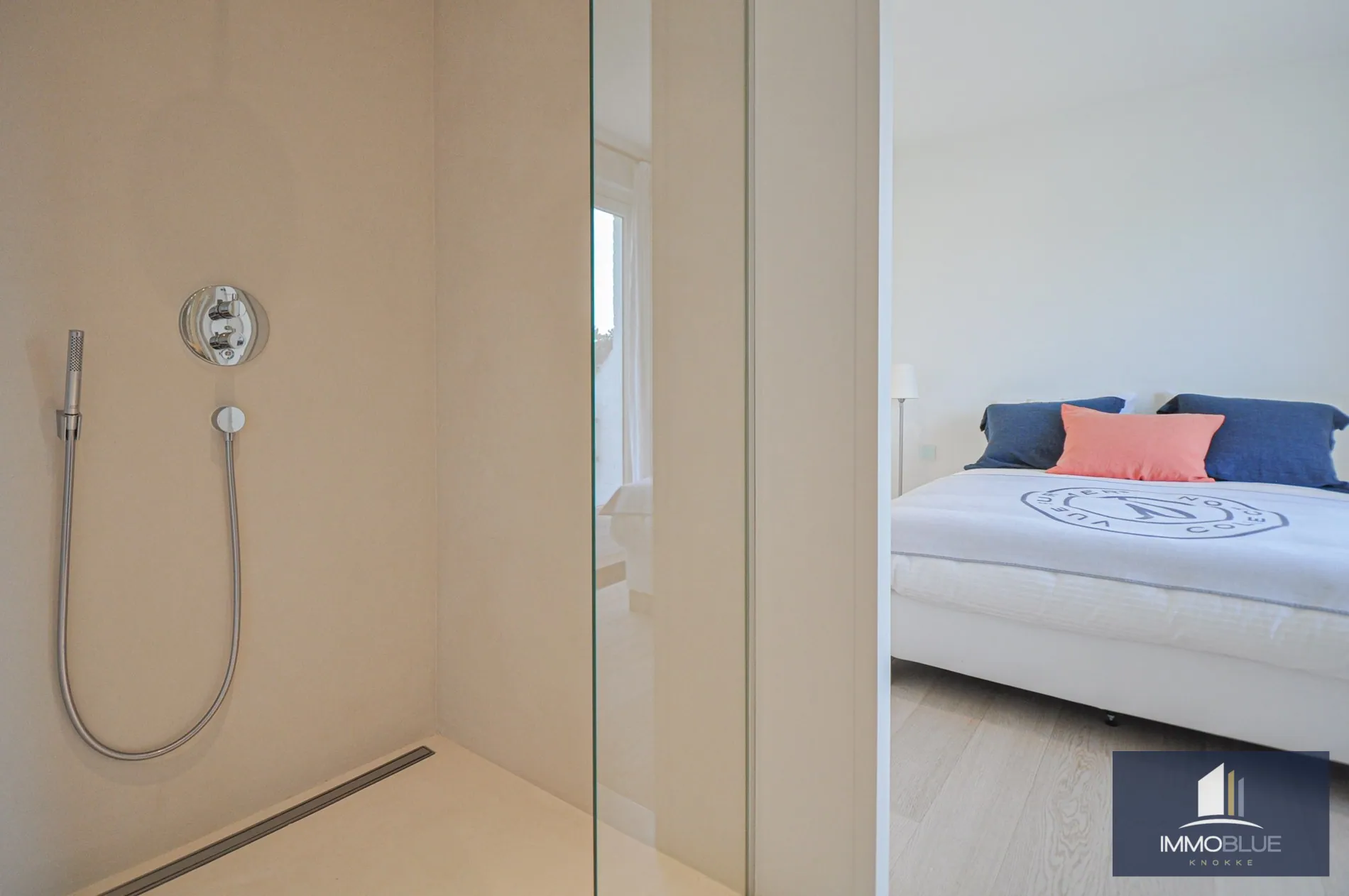 Cet appartement au style intemporel dispose de trois grandes terrasses offrant une vue splendide sur les jardins magnifiquement aménagés du domaine ainsi que sur le Royal Zoute Tennis Club.