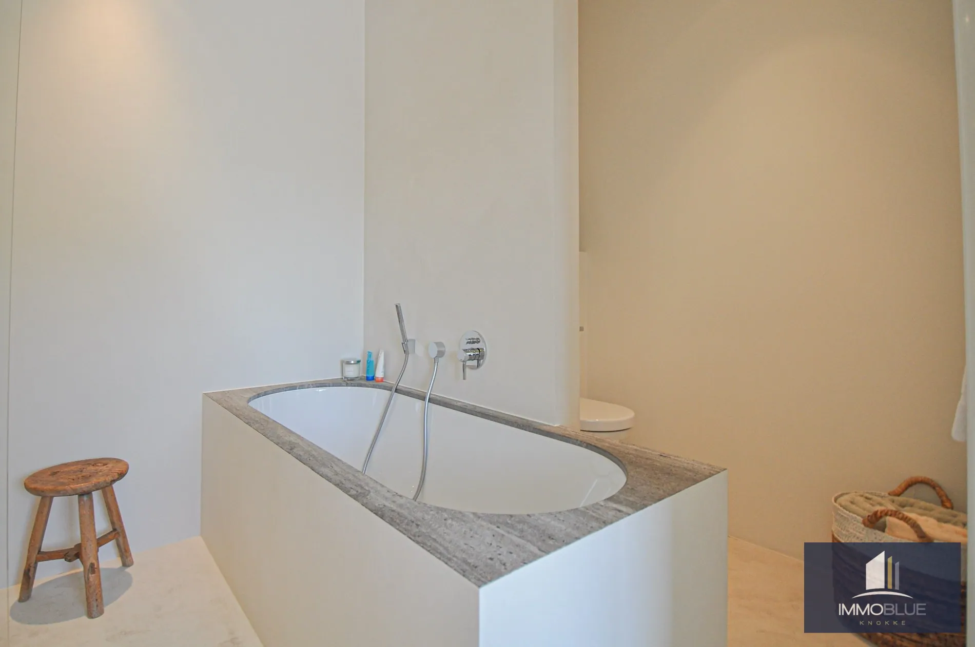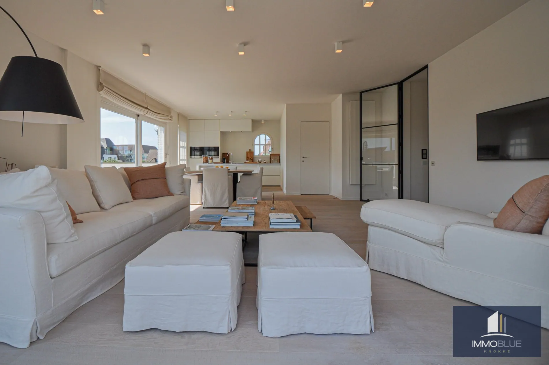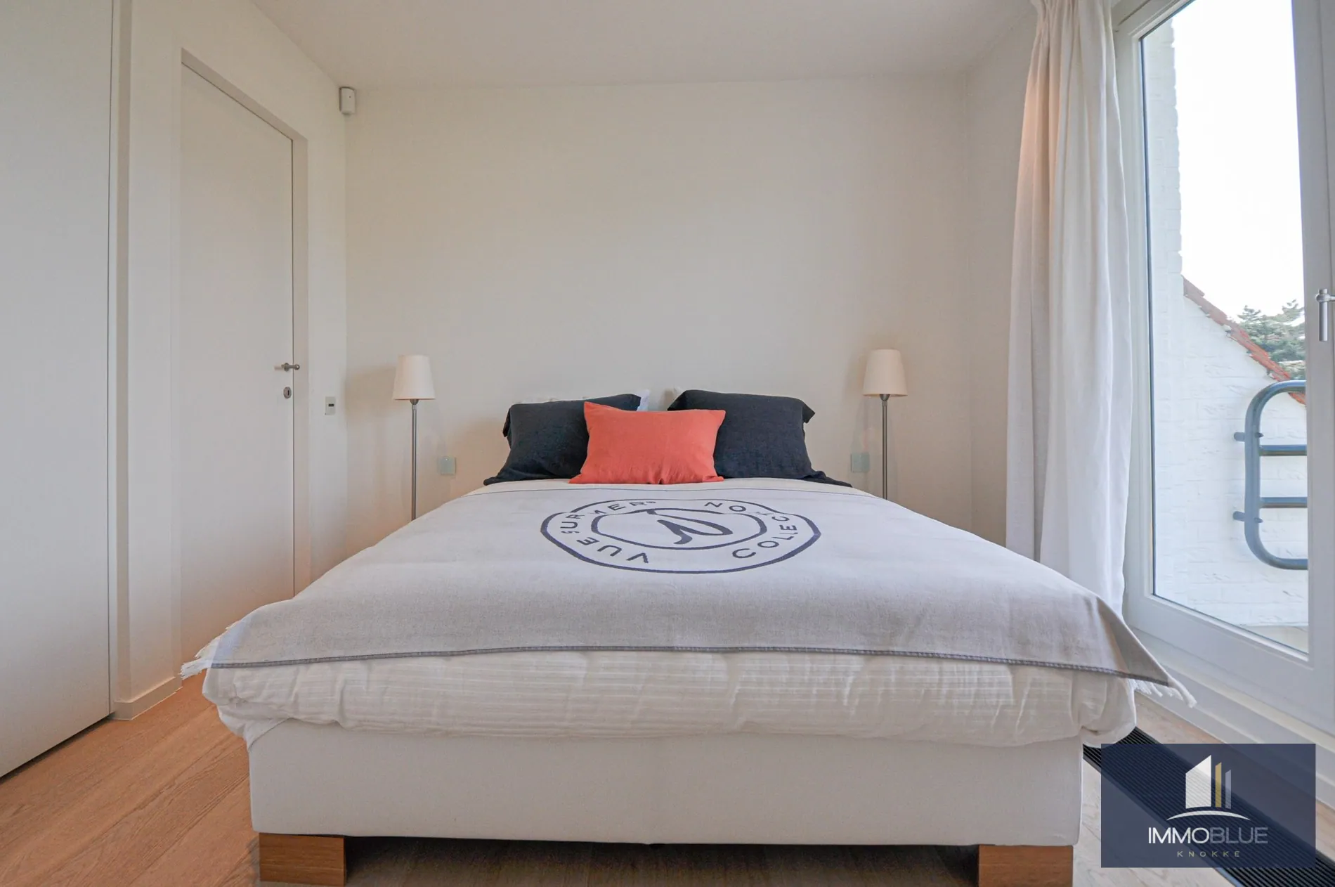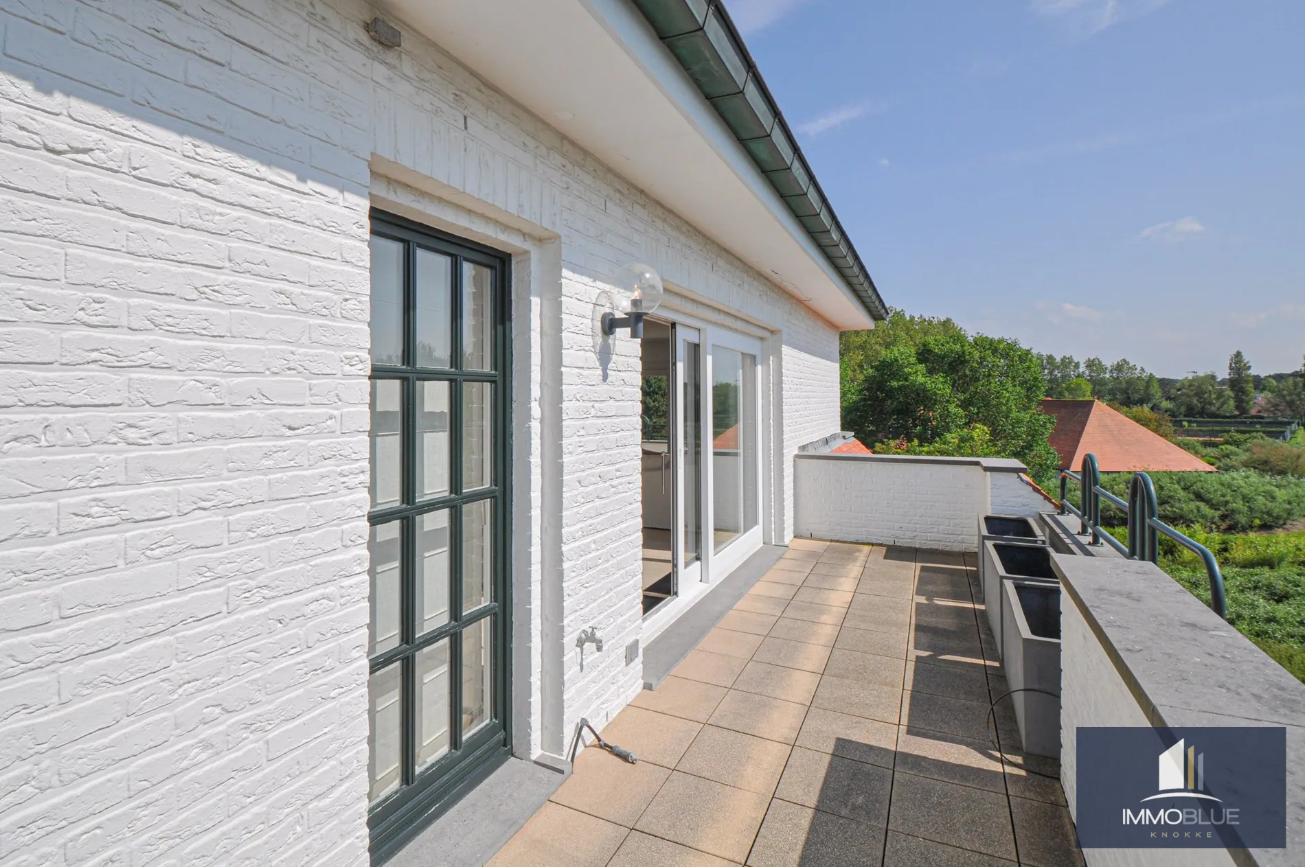 Cet appartement au style intemporel dispose de trois grandes terrasses offrant une vue splendide sur les jardins magnifiquement aménagés du domaine ainsi que sur le Royal Zoute Tennis Club.