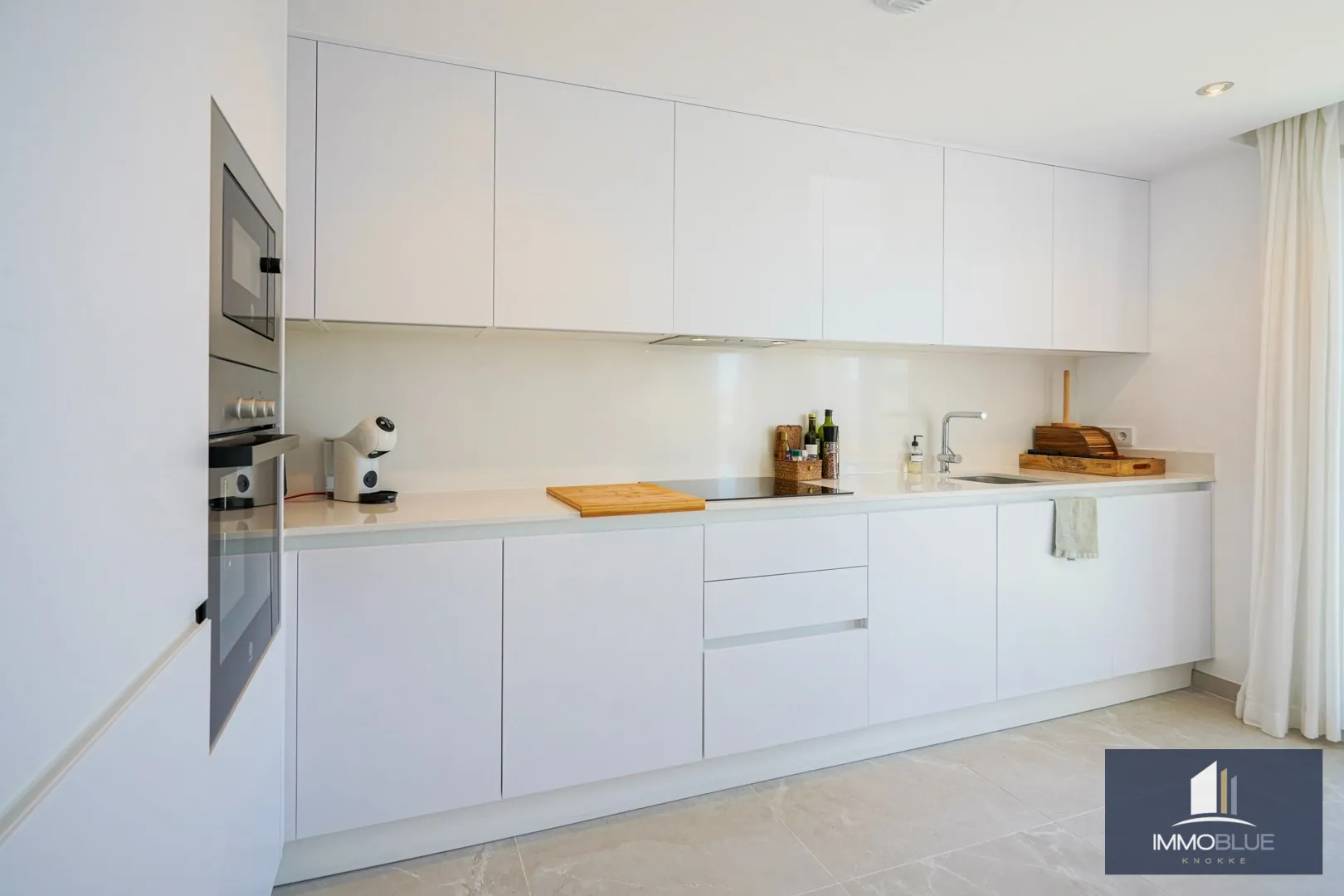 Disposition : hall d’entrée menant à un salon lumineux, où la vue spectaculaire sur la mer attire immédiatement le regard. Des baies vitrées donnent accès à la terrasse. La cuisine moderne et entièrement équipée est attenante au salon et donne également accès à la terrasse.