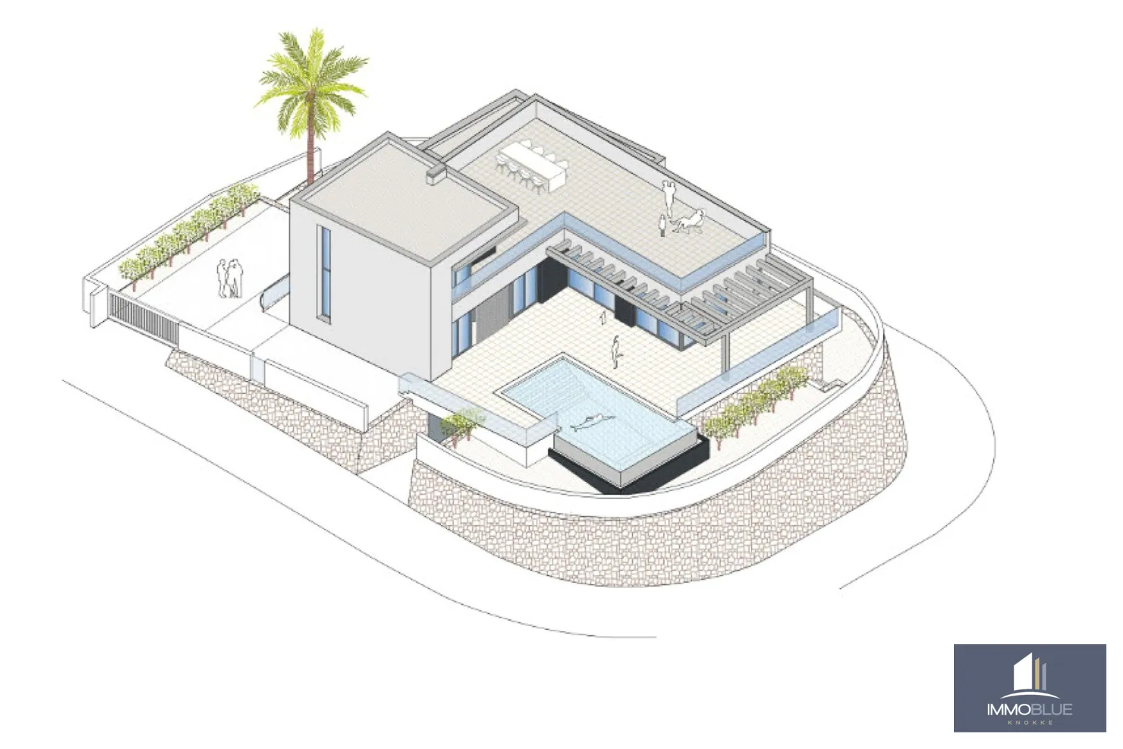Aménagement : espace de vie spacieux et élégant qui se fond parfaitement dans une cuisine moderne et entièrement équipée. De grandes fenêtres laissent entrer la lumière du soleil abondamment et harmonieusement relie l’intérieur avec la terrasse et la piscine privée. Cela crée un cadre idéal pour profiter du climat méditerranéen toute l’année. Au même étage, il y a deux chambres doubles confortables avec placards et une salle de bains, ainsi que des toilettes invités.