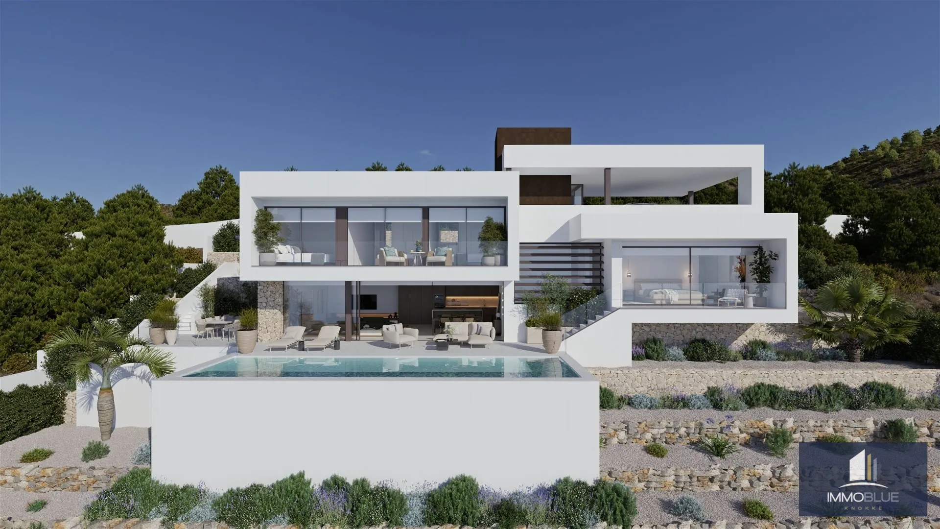 La villa s’étend sur deux niveaux et comprend quatre chambres avec salles de bains privatives. Elle dispose également d’un vaste séjour avec salle à manger et cuisine ouverte, donnant directement accès à la terrasse principale avec piscine à débordement et vue sur la mer. Toutes les pièces principales bénéficient d’un accès direct à l’extérieur.