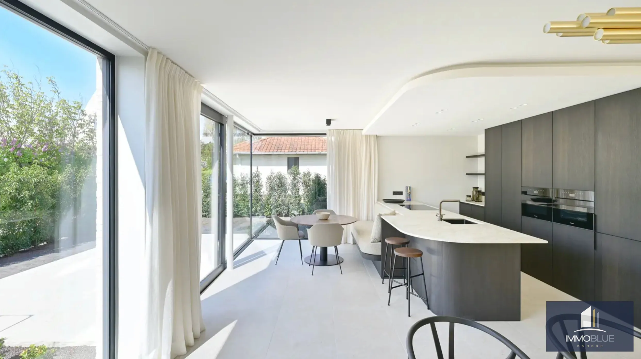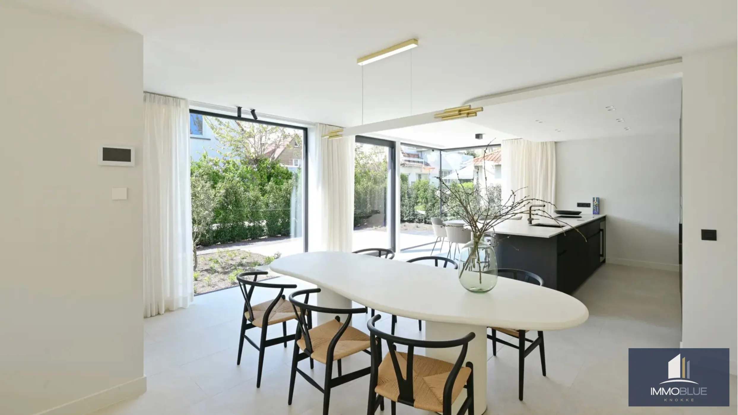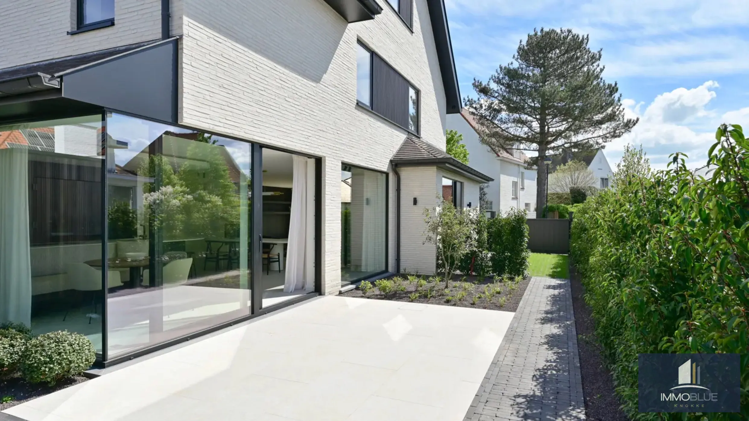 Cette villa jumelée neuve unique et située au calme, avec 6 chambres à coucher complètes, se trouve à proximité de la digue et à proximité du centre de Knokke. La durabilité est une valeur fondamentale dans cette maison, avec un excellent niveau E (E19 - maison BEN) comme preuve. La maison est équipée, entre autres, d'une pompe à chaleur (géothermie), de plusieurs panneaux solaires, d'un système de ventilation de type C+, de chauffage par le sol avec fonction de refroidissement sur 3 étages, d'une borne de recharge pour véhicules électriques, de caméras de surveillance, d'une citerne d'eau de pluie de 5000 litres, ... L'intérieur complet de la maison a été conçu par l'architecte d'intérieur Bryan Chielens. De plus, il est possible d'acheter les meubles, fournis par RR Interieur Knokke-Heist. Disposition du rez-de-chaussée : hall d'entrée avec toilettes invités. Séjour très lumineux avec de grandes baies vitrées donnant accès au jardin ensoleillé et facile d'entretien avec 2 terrasses et un abri de jardin/vélos, aménagé par le groupe ECO Tuinarchitectengroep. Cuisine ouverte luxueuse et entièrement équipée avec des appareils Miele. Espace de rangement adjacent avec raccordements pour une machine à laver et un sèche-linge. Disposition du 1er étage : palier avec toilettes séparées. À ce niveau se trouve la chambre principale, équipée de plusieurs placards encastrés, et avec une luxueuse salle de douche (avec douche à l'italienne et double lavabo). Il y a également 2 autres chambres à coucher complètes avec différents placards encastrés et un bureau, chacune avec une salle de douche attenante. Disposition du 2ème étage : palier avec toilettes séparées. À ce niveau se trouvent 3 autres chambres à coucher complètes avec des placards encastrés et un bureau/rangement. Il y a également une salle de bain séparée avec baignoire et lavabo. Grand grenier. Vente séparée du terrain et de la construction.