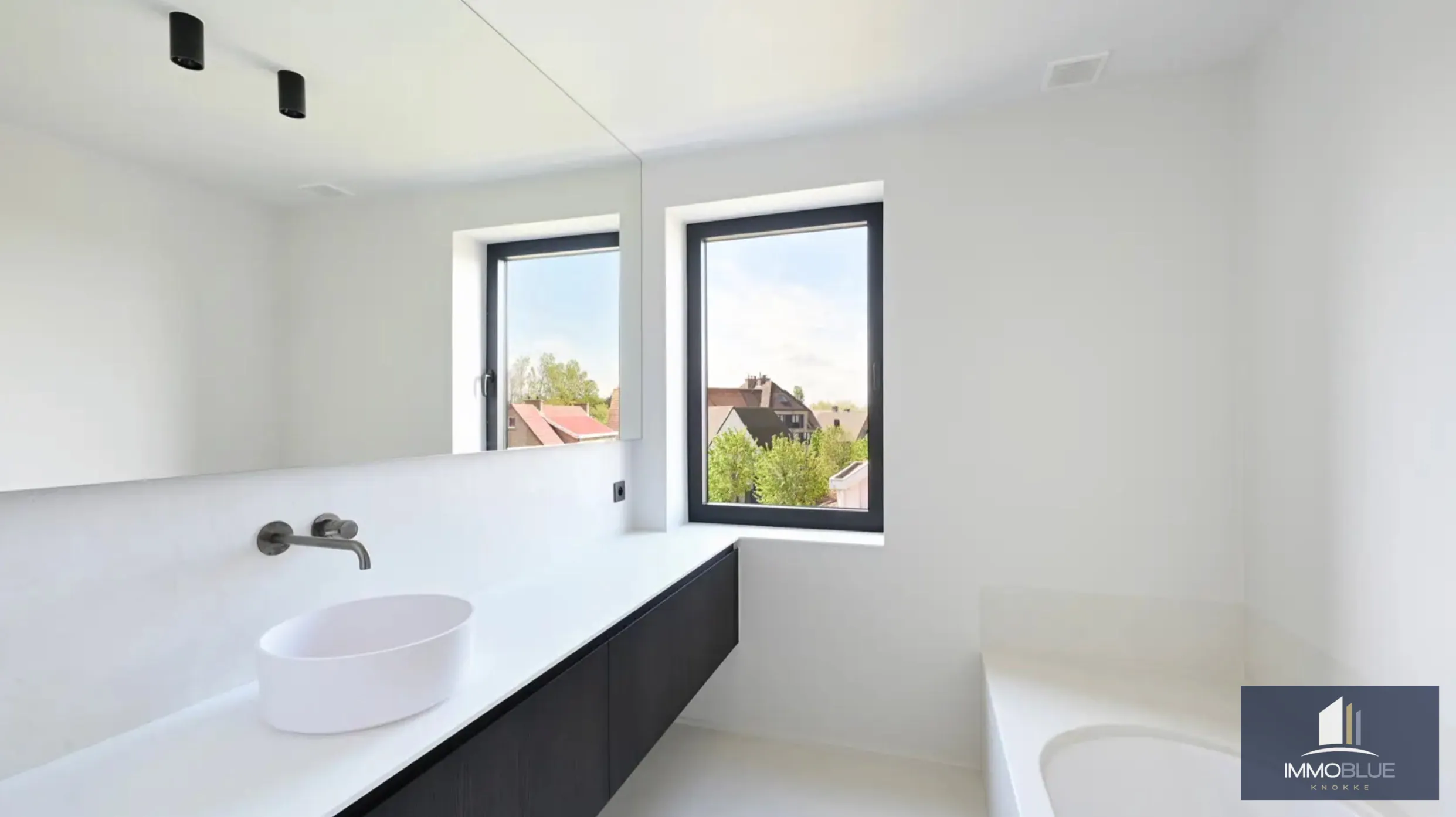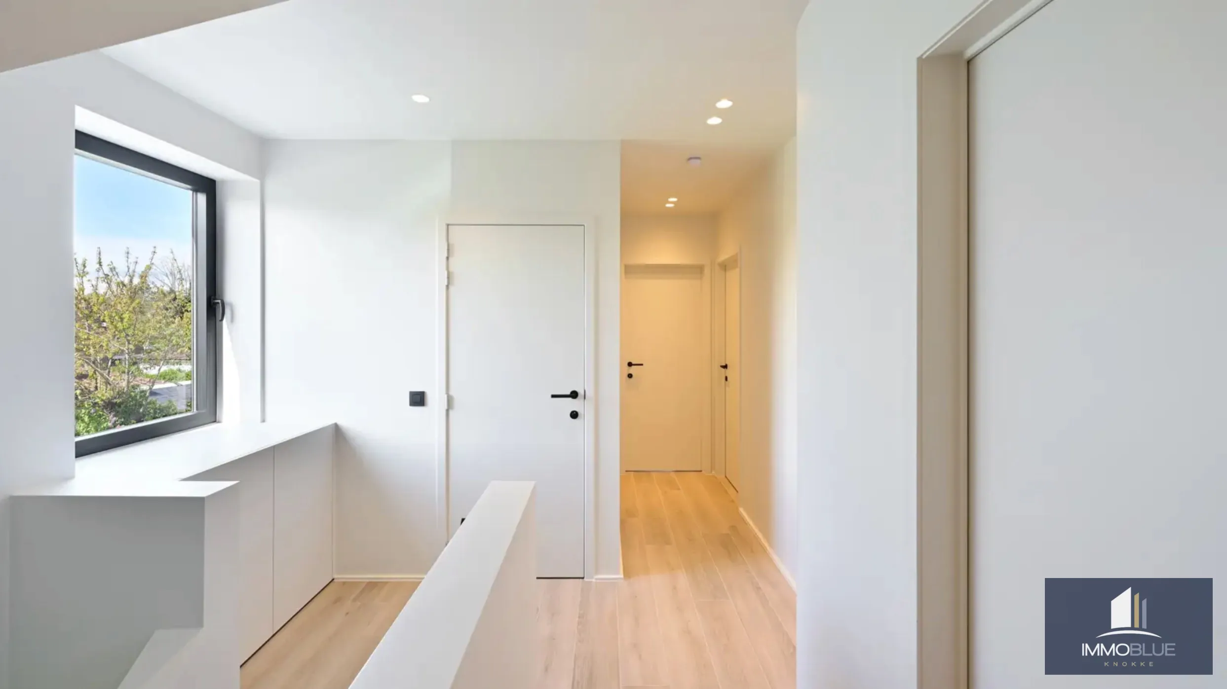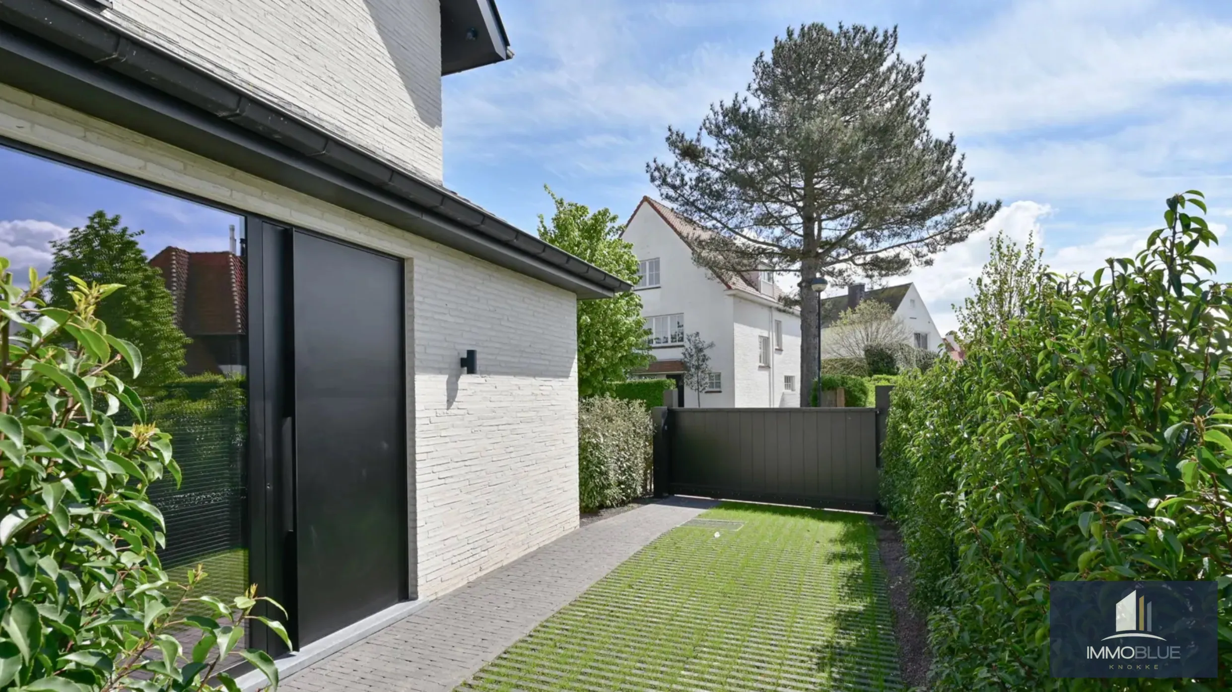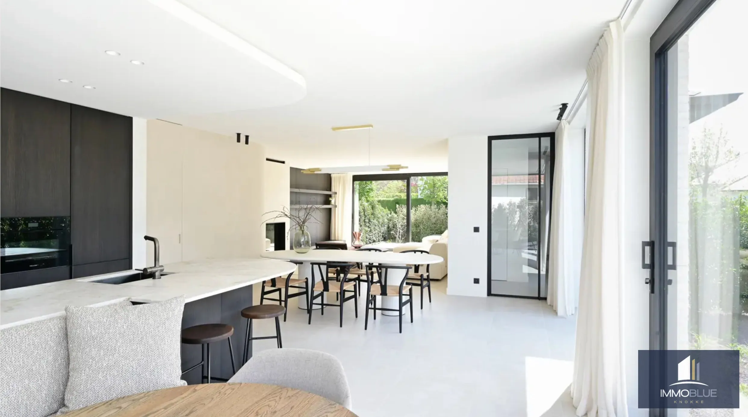 Cette villa jumelée neuve unique et située au calme, avec 6 chambres à coucher complètes, se trouve à proximité de la digue et à proximité du centre de Knokke. La durabilité est une valeur fondamentale dans cette maison, avec un excellent niveau E (E19 - maison BEN) comme preuve. La maison est équipée, entre autres, d'une pompe à chaleur (géothermie), de plusieurs panneaux solaires, d'un système de ventilation de type C+, de chauffage par le sol avec fonction de refroidissement sur 3 étages, d'une borne de recharge pour véhicules électriques, de caméras de surveillance, d'une citerne d'eau de pluie de 5000 litres, ... L'intérieur complet de la maison a été conçu par l'architecte d'intérieur Bryan Chielens. De plus, il est possible d'acheter les meubles, fournis par RR Interieur Knokke-Heist. Disposition du rez-de-chaussée : hall d'entrée avec toilettes invités. Séjour très lumineux avec de grandes baies vitrées donnant accès au jardin ensoleillé et facile d'entretien avec 2 terrasses et un abri de jardin/vélos, aménagé par le groupe ECO Tuinarchitectengroep. Cuisine ouverte luxueuse et entièrement équipée avec des appareils Miele. Espace de rangement adjacent avec raccordements pour une machine à laver et un sèche-linge. Disposition du 1er étage : palier avec toilettes séparées. À ce niveau se trouve la chambre principale, équipée de plusieurs placards encastrés, et avec une luxueuse salle de douche (avec douche à l'italienne et double lavabo). Il y a également 2 autres chambres à coucher complètes avec différents placards encastrés et un bureau, chacune avec une salle de douche attenante. Disposition du 2ème étage : palier avec toilettes séparées. À ce niveau se trouvent 3 autres chambres à coucher complètes avec des placards encastrés et un bureau/rangement. Il y a également une salle de bain séparée avec baignoire et lavabo. Grand grenier. Vente séparée du terrain et de la construction.